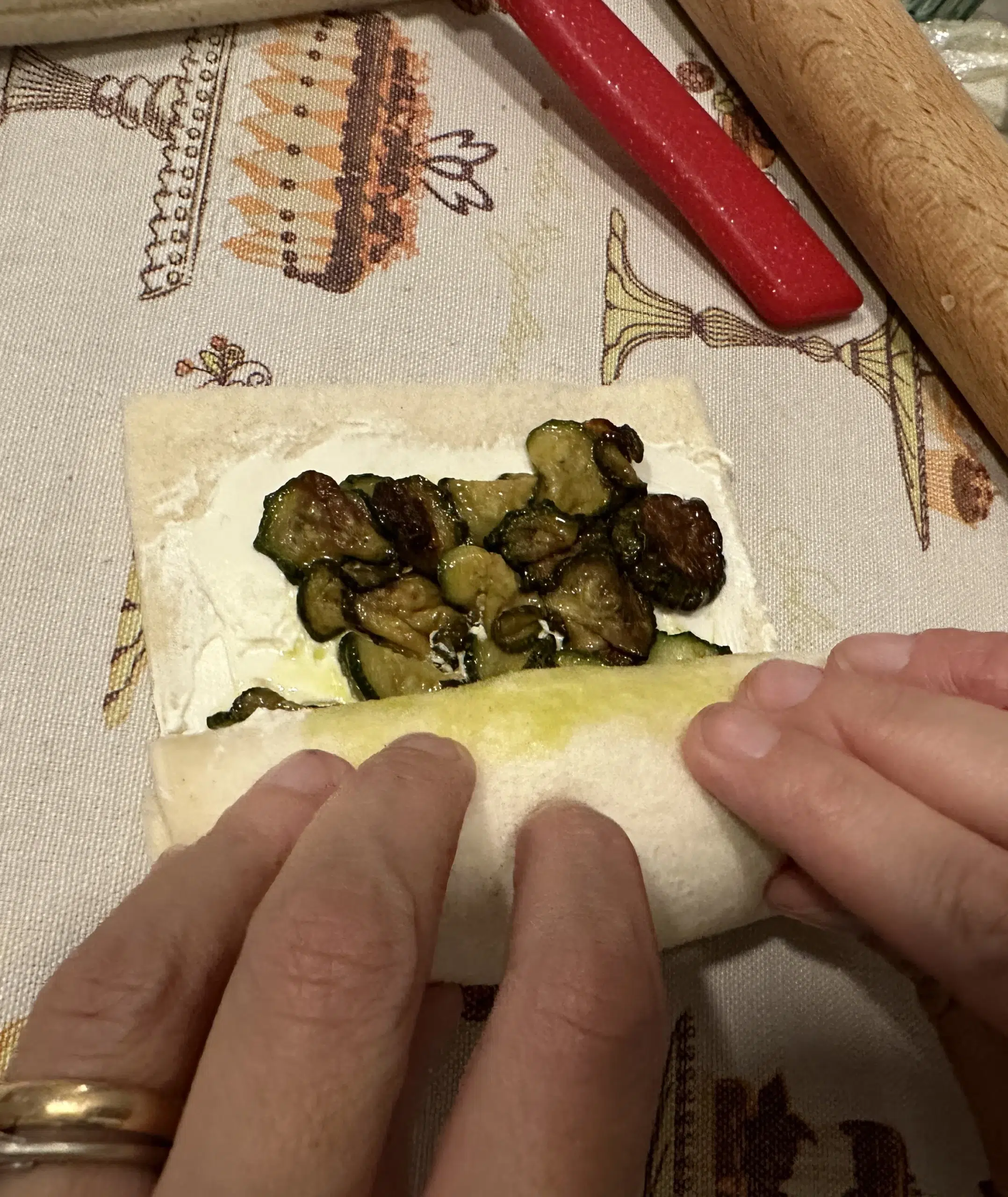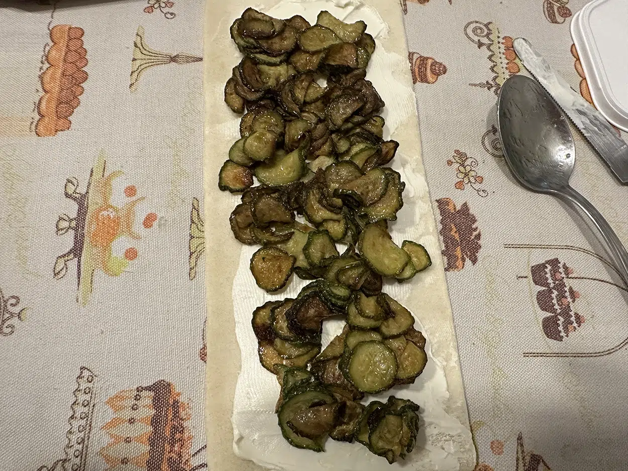 Una volta cotte mettiamole da parte e facciamole un po’ asciugare. Una volta fatto questo procedimento prendiamo i nostri fogli di pan carrè. Stendiamoli bene. Adesso spalmiamo i nostro fogli con la philadelphia o il formaggio spalmabile. Disponiamo ora le zucchine sul letto di formaggio fresco e mettiamo qualche scaglia di parmigiano.