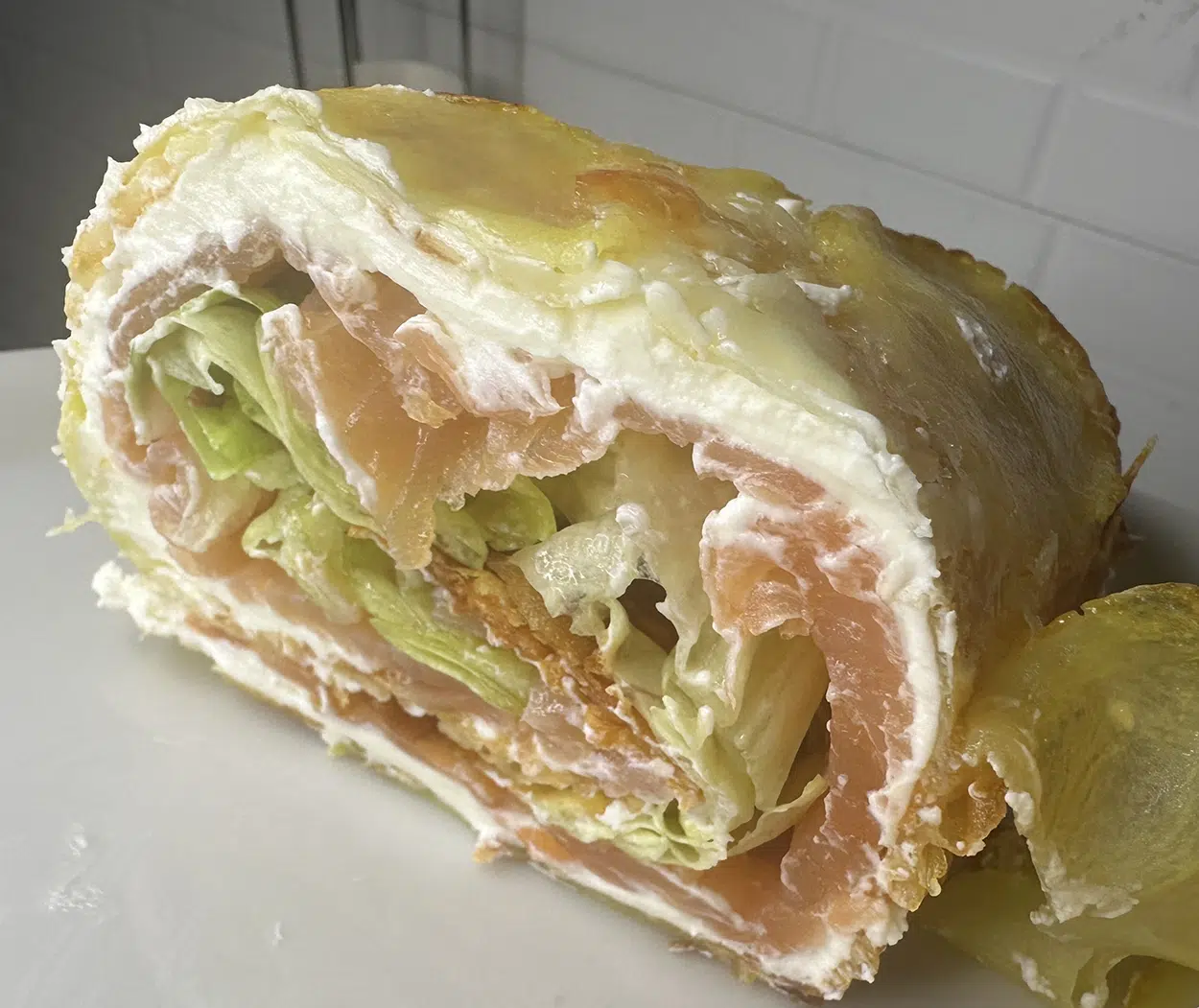 Una volta sfornato, toglietelo dalla teglia e lasciatelo intiepidire ( non dovrà essere freddo). Appena intiepidito ( non caldo) giratelo sottosopra: la parta del formaggio dovrà essere all’insù. Spalmate la robiola o formaggio fresco in generale ( anche philadelphia). Una volta spalmata stendete un tappeto di salmone e poi la rucola o l’insalata. Arrotolate e gustate.