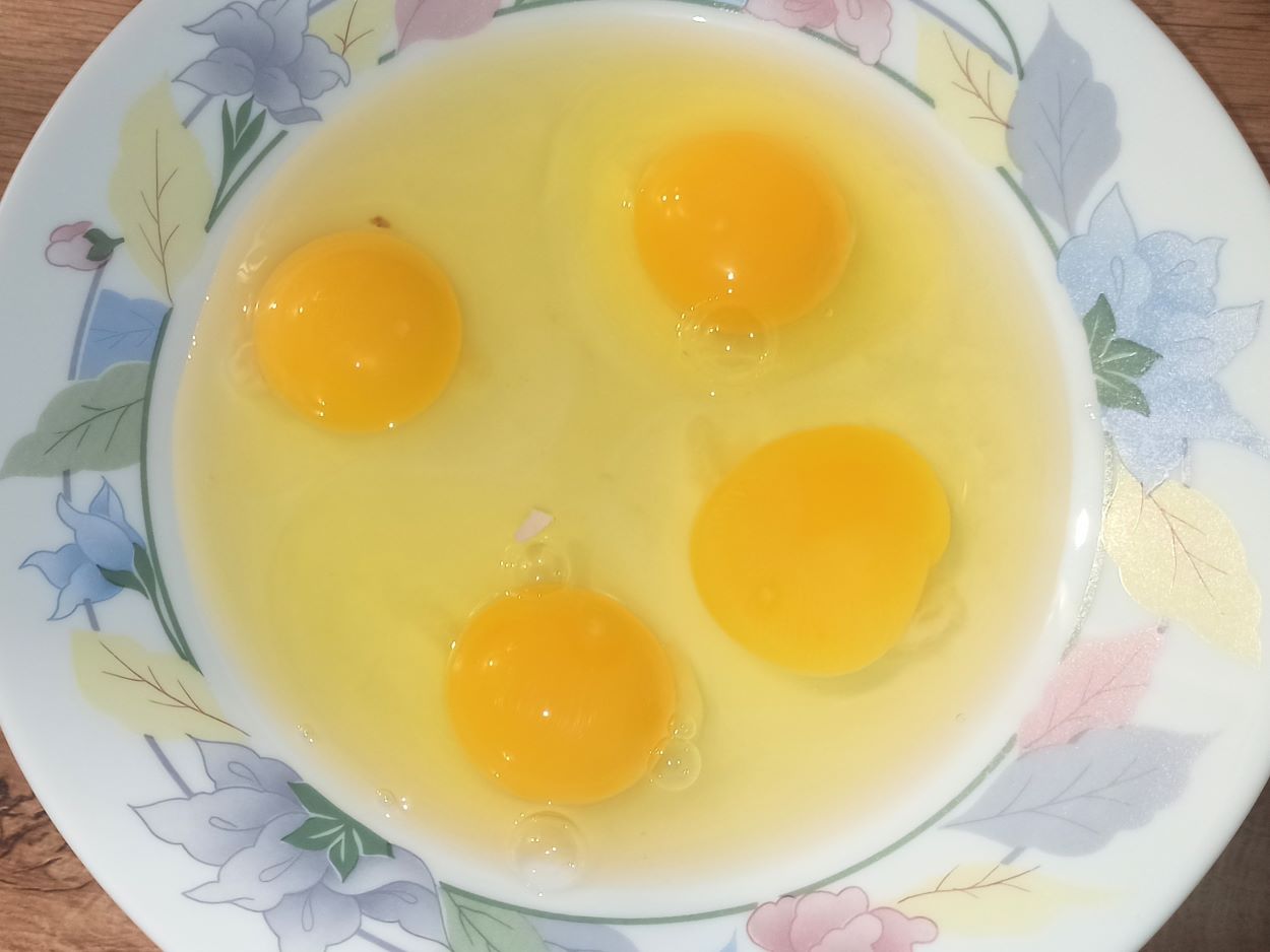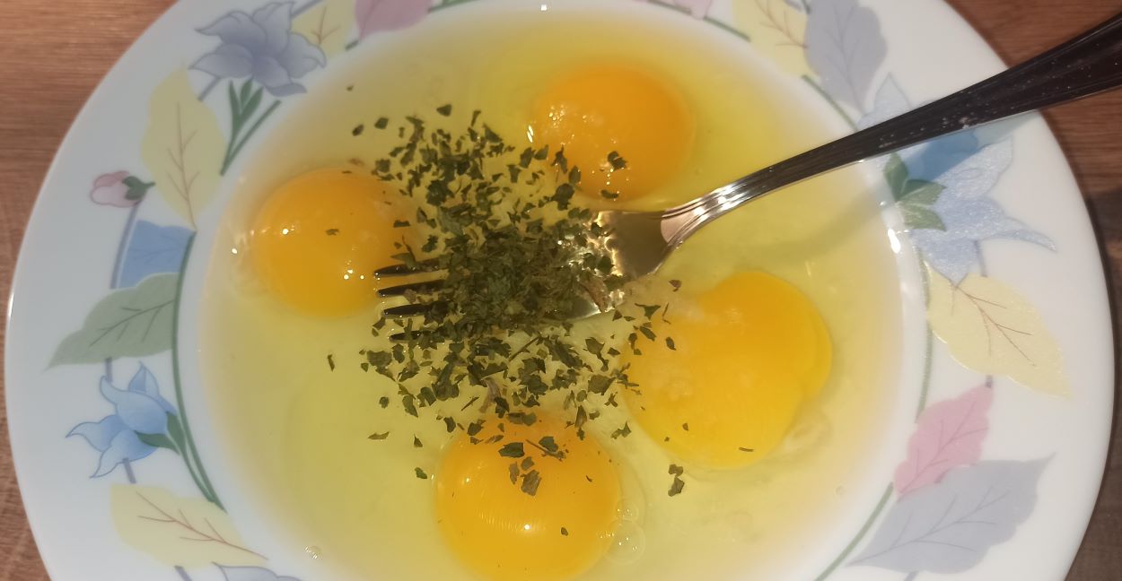 Per preparare il rotolo frittata del goloso, iniziate ad aprire le uova in un piatto.