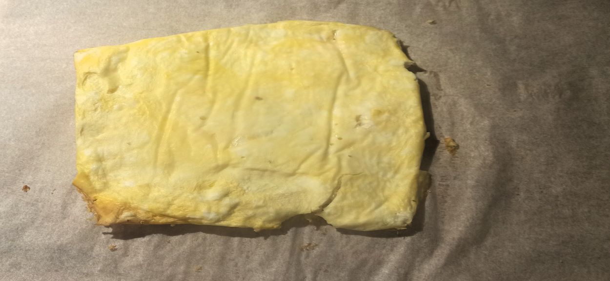 Posizionate la frittata sul piano da lavoro, rimuovendo delicatamente la carta forno.