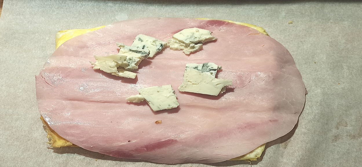 Ricoprite la superfice con le fette di prosciutto cotto e dei pezzetti di gorgonzola.