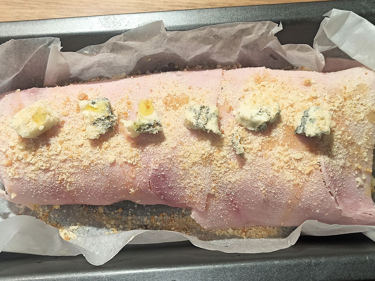Posizionate il rotolo in uno stampo per plumcake, rivestito da carta forno. Completate con altri pezzetti di gorgonzola e una spolverate di pane grattugiato.