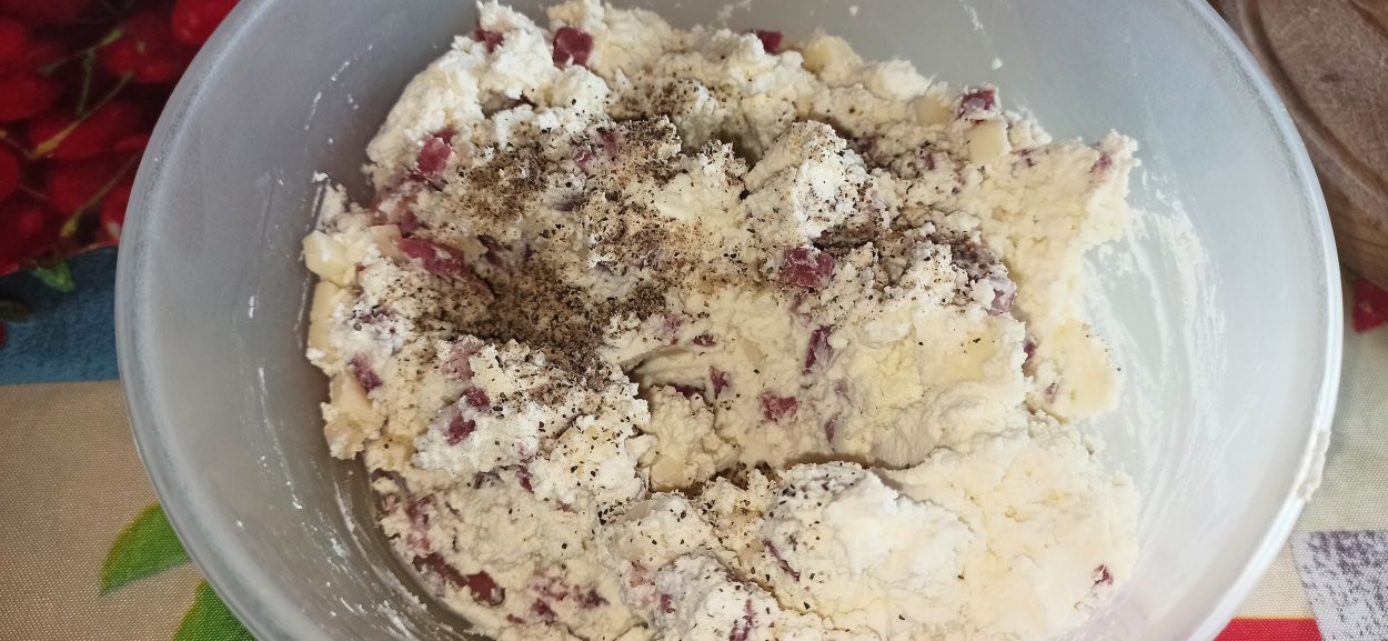 Setacciate la ricotta e mettetela in una ciotola. Aggiungete il pecorino, l’uovo e mescolate bene, poi aggiungete il salame ed il provolone. Amalgamate bene il tutto, infine regolate di sale e pepe.