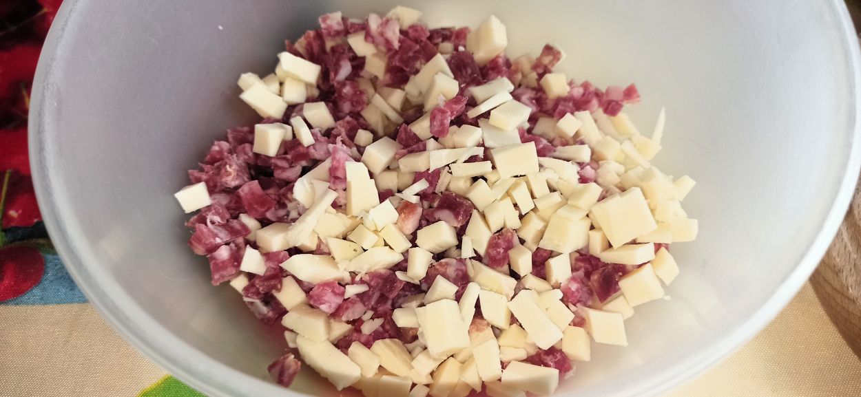 Per preparare il Rustico napoletano sbrisolone, iniziate a preparare la pasta frolla, mescolando insieme tutti gli ingredienti. Tagliate a pezzetti piccoli, il salame ed il provolone.