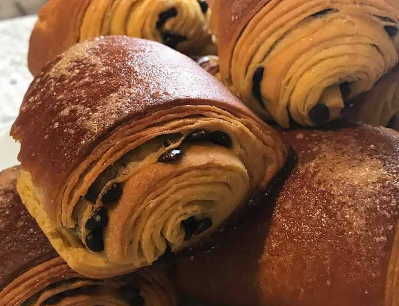 Continuate così con tutti i panetti e man mano li impilate. L’ultimo disco deve rimane senza burro. Mettere in frigorifero per circa mezz’ora. Riprendere l’impasto e formare un grande rettangolo. Distribuire le gocce di cioccolato. Dividere a metà per lunghezza e poi ricavare per ogni metà 6 rettangoli. In tutto 12 piccoli rettangoli. Arrotolare e mettere su una placca foderata con carta forno distanziati tra loro.