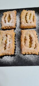 Distribuite un po’ di ripieno al centro di ogni rettangolo, dalla parte non tagliata. Chiudete i saccottini piegando la sfoglia e sigillate bene i bordi premendo con una forchetta. Preriscaldate la friggitrice ad aria o il forno. Disponete i saccottini su carta forno e cuoceteli a 190°C per 10 minuti , o fino a quando saranno ben dorati e croccanti. Lasciate intiepidire i saccottini e spolverateli con zucchero a velo. Perfetti per una colazione leggera, questi saccottini si preparano in un attimo e sono ideali per tutta la famiglia. Buon appetito!