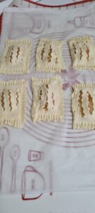 Iniziamo con la Preparazione della sfoglia: Stendete il rotolo di pasta sfoglia su una superficie piana e dividetelo in 6 rettangoli uguali. Su ciascun rettangolo, praticate dei tagli paralleli su un lato, come mostrato in foto (serviranno per chiudere i saccottini). Ora bisogna passare alla Preparazione del ripieno : Grattugiate una mela e mettetela in una ciotola. Aggiungete un cucchiaio di marmellata, la scorza di limone grattugiata e un pizzico di cannella. Mescolate bene il tutto.