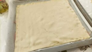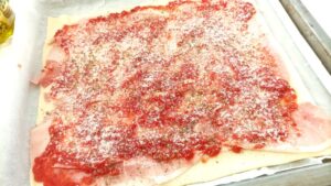 In una vassoio stendete un rotolo di pasta sfoglia, sopra alla sua carta forno; spennellate la pasta sfoglia con un tuorlo d’uovo sbattuto con un pizzico di sale. Quindi procedete alla farcitura: stendete le fette di formaggio e di prosciutto cotto, spalmate il pomodoro su tutta la superficie della pasta sfoglia, cospargete con un pizzico di sale, il parmigiano ed origano. Appoggiate sopra l’altro rettangolo di pasta sfoglia. Con una rotella taglia pizza o un coltellino affilato, create delle strisce di 2 cm, poi nell’altro senso per creare dei quadratini 2 x 2 cm, oppure più grandi, a piacere: una volta cotti, basterà solo staccarli tra di loro.