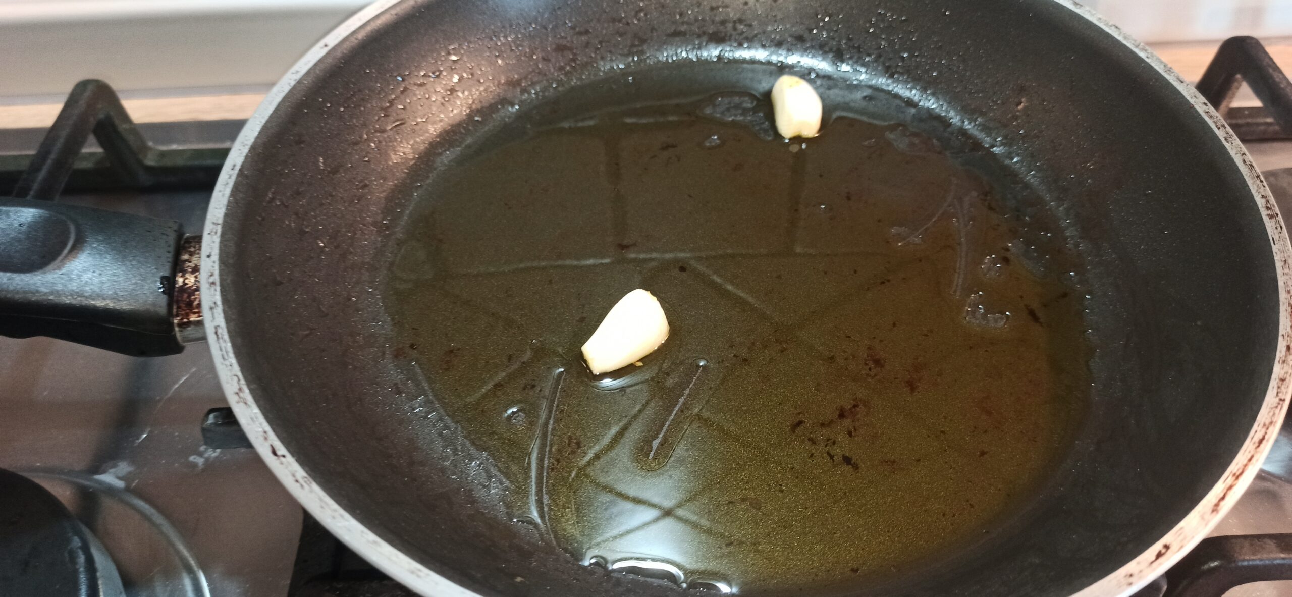 Mettete le salsicce da parte, nelle stessa padella aggiungete un filo d’olio evo, fate rosolare ed eliminate lo spicchi d’aglio.
