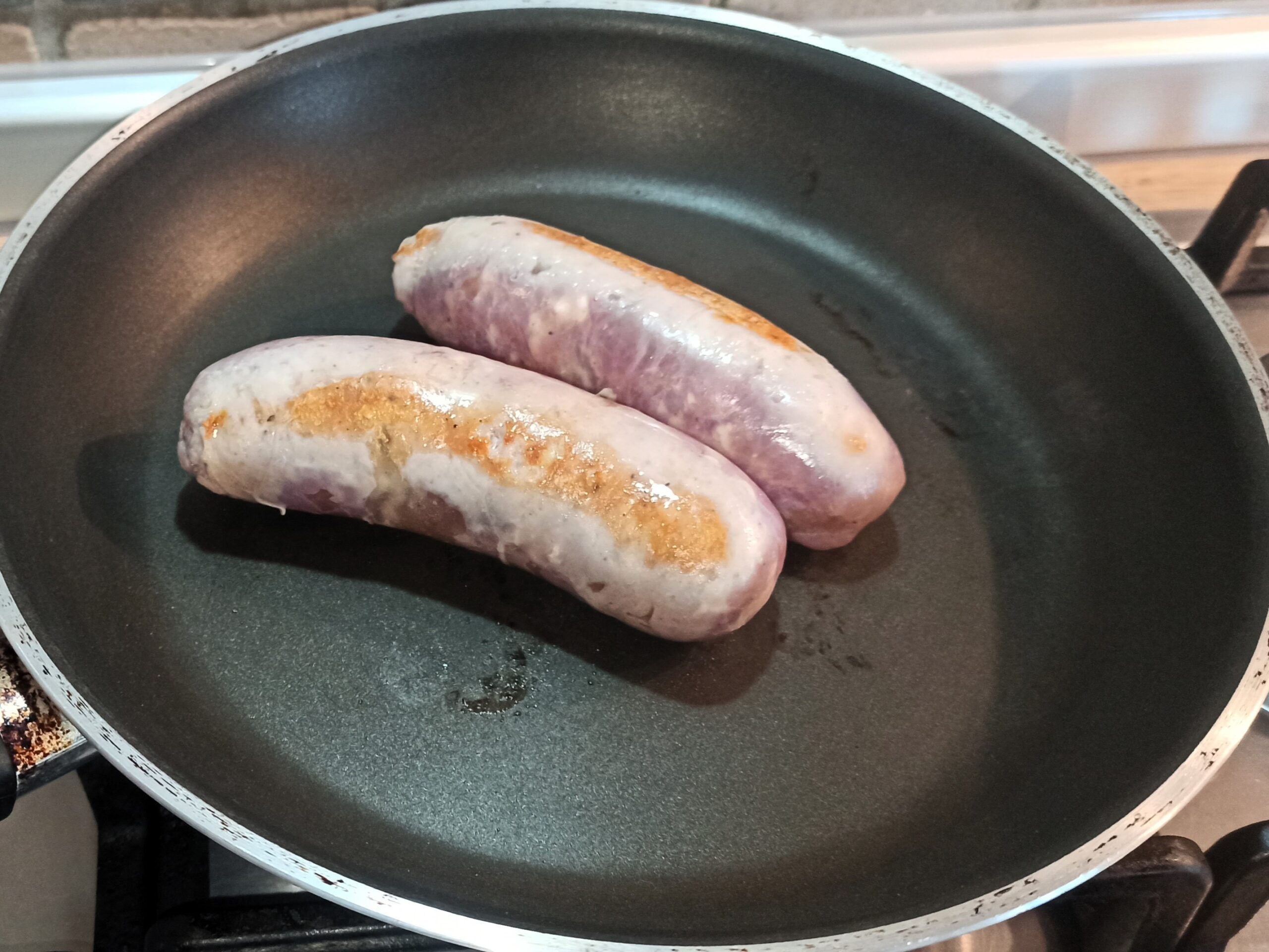 A questo punto unite le salsicce, profumate con l’origano, e fatele cuocere per un paio di minuti per lato, con la padella coperta.