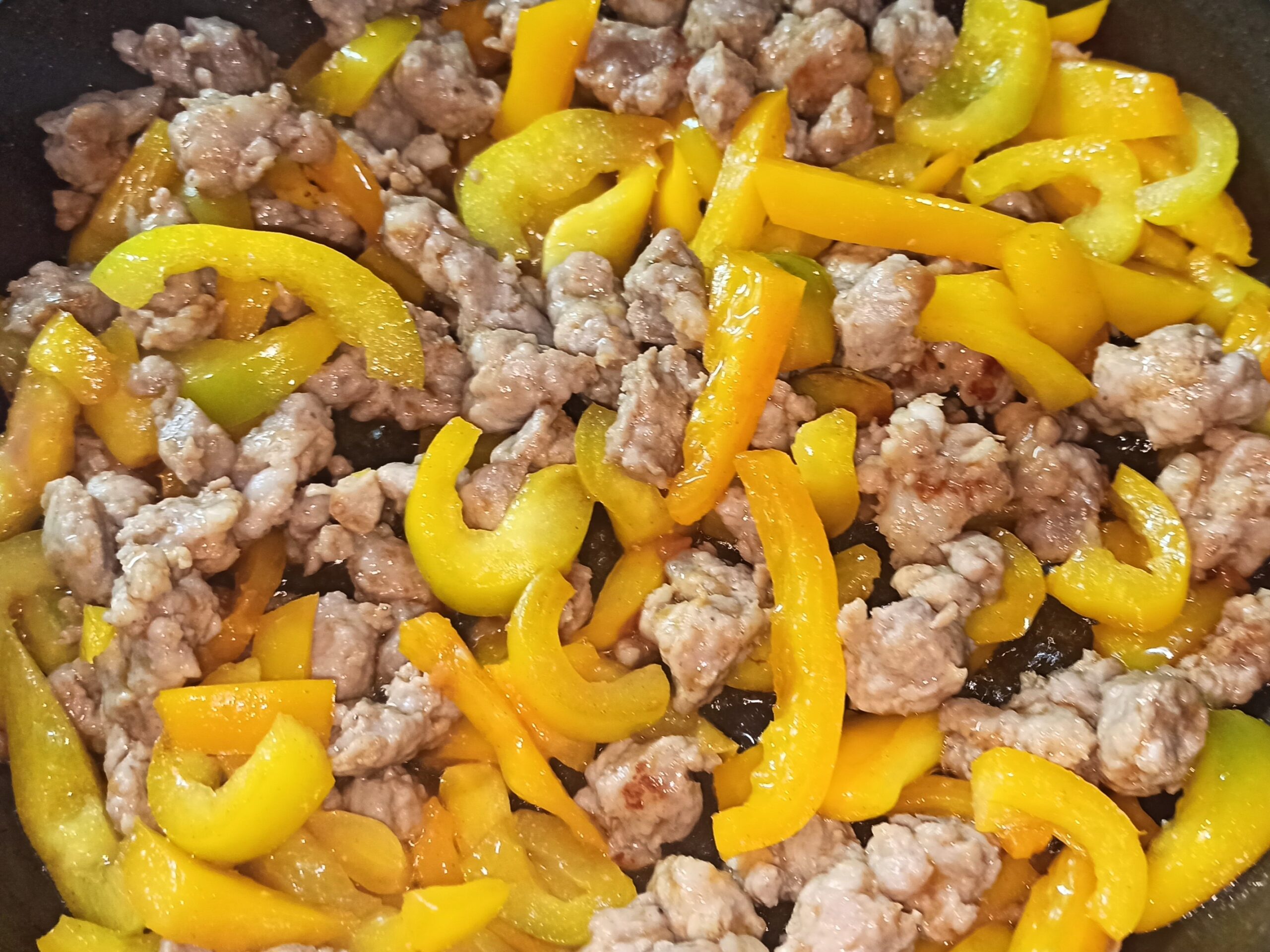 Lavate e tagliate a filetti il peperone, ed unitelo nella padella insieme alla salsiccia.