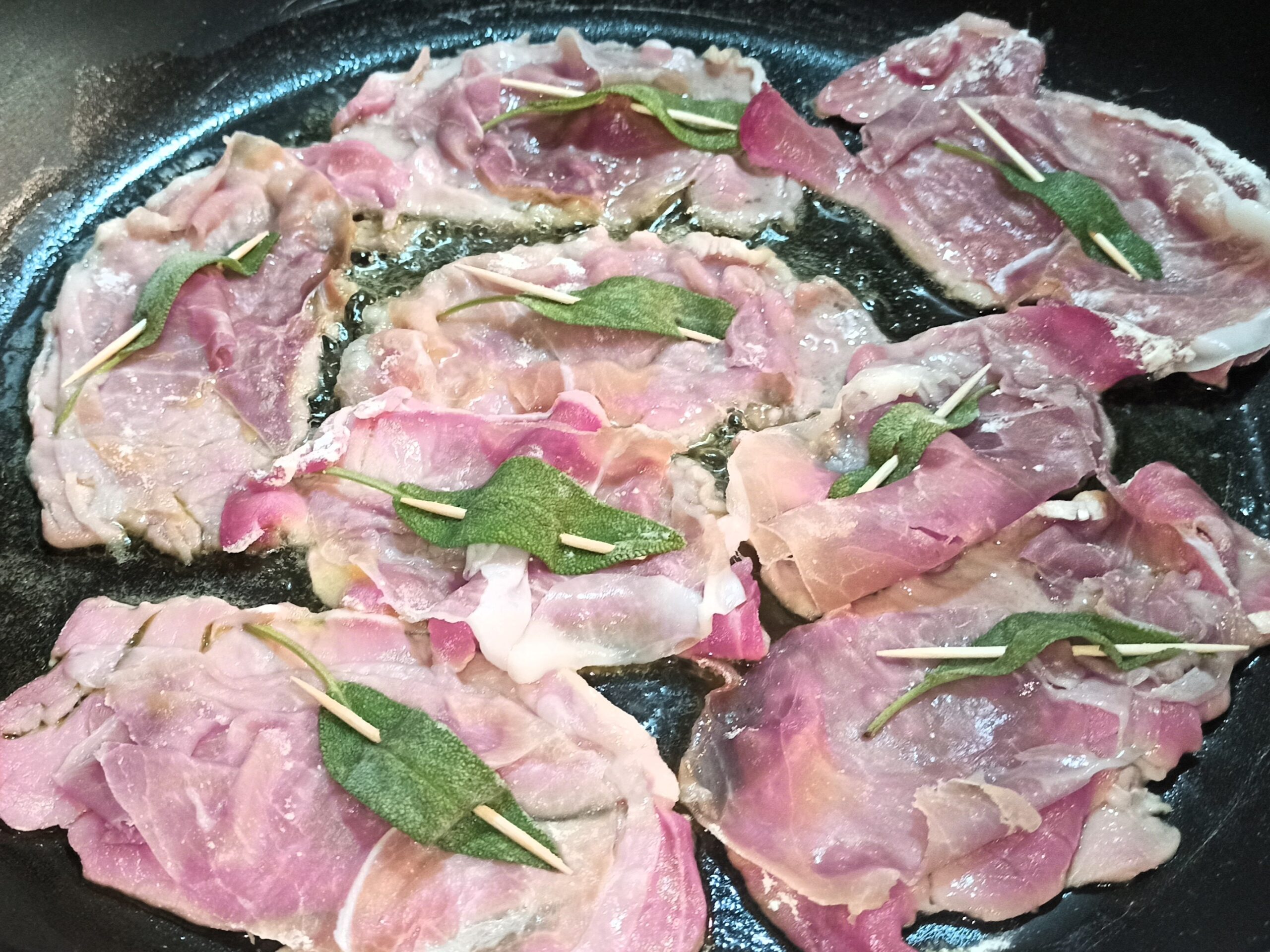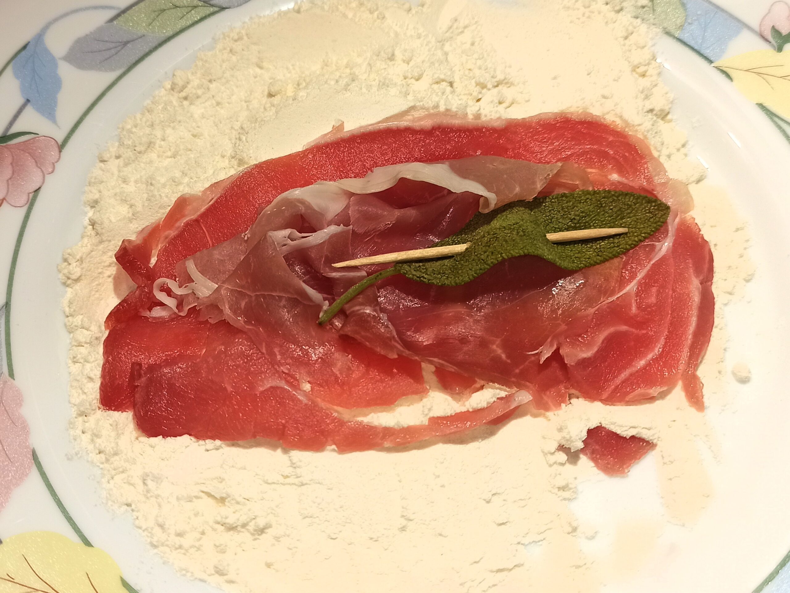 Per preparare i saltimbocca alla romana, disponete le fettine di carne sul piano da lavoro, adagiate su ognuna, una fettina di prosciutto crudo, una fogliolina di salvia, e bloccate il tutto con uno stuzzicadenti.