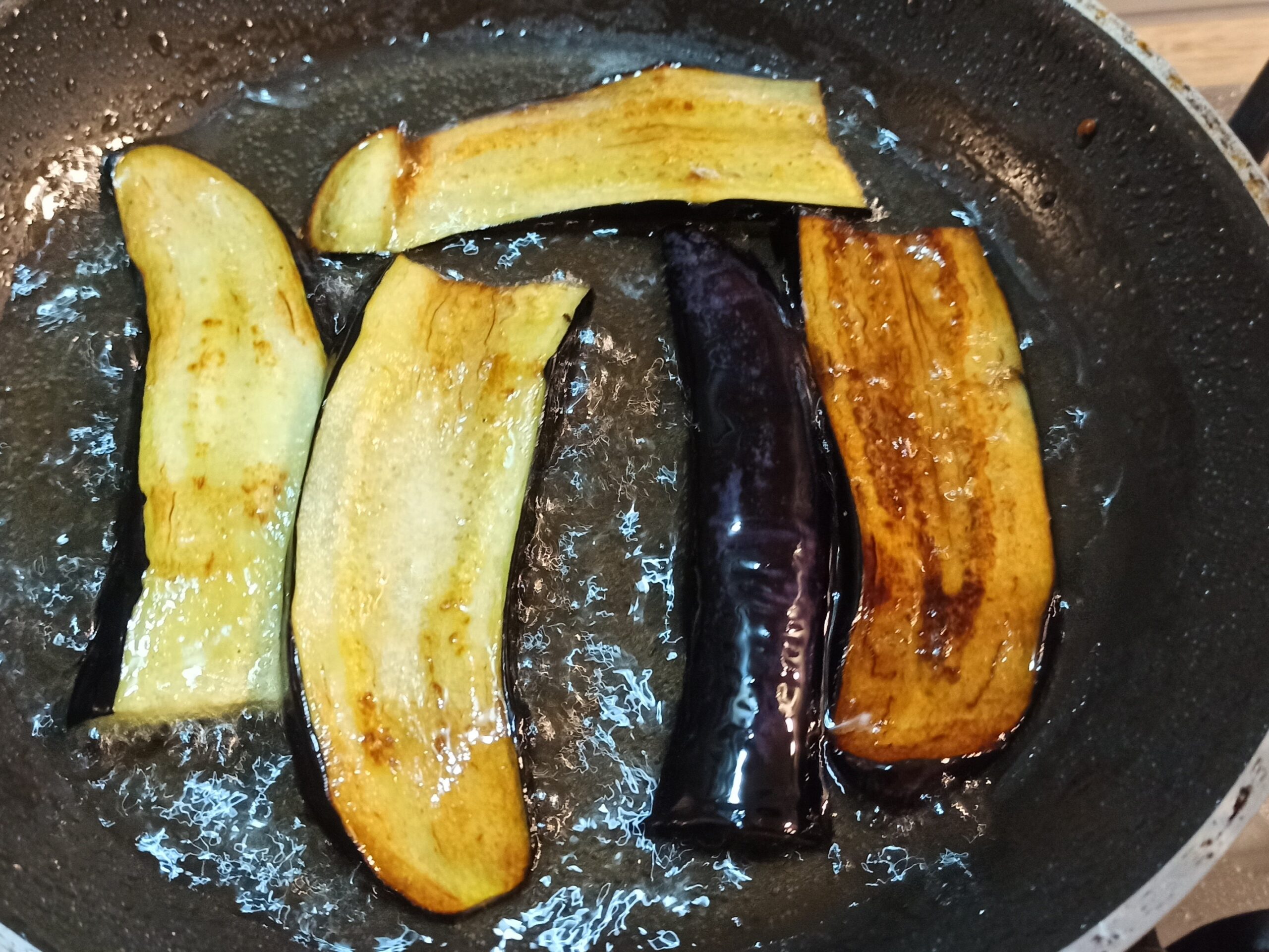 Iniziate a lavare ed asciugare le melanzane, eliminate le due estremità. Tagliatele a fette nel senso della lunghezza, lo spessore dovrà essere di circa mezzo centimetro, la lunghezza secondo i vostri gusti. In una capiente padella mettete a scaldare l’olio di semi di arachidi, appena sarà a temperatura, iniziate a friggere le melanzane, dovranno risultare belle dorate.