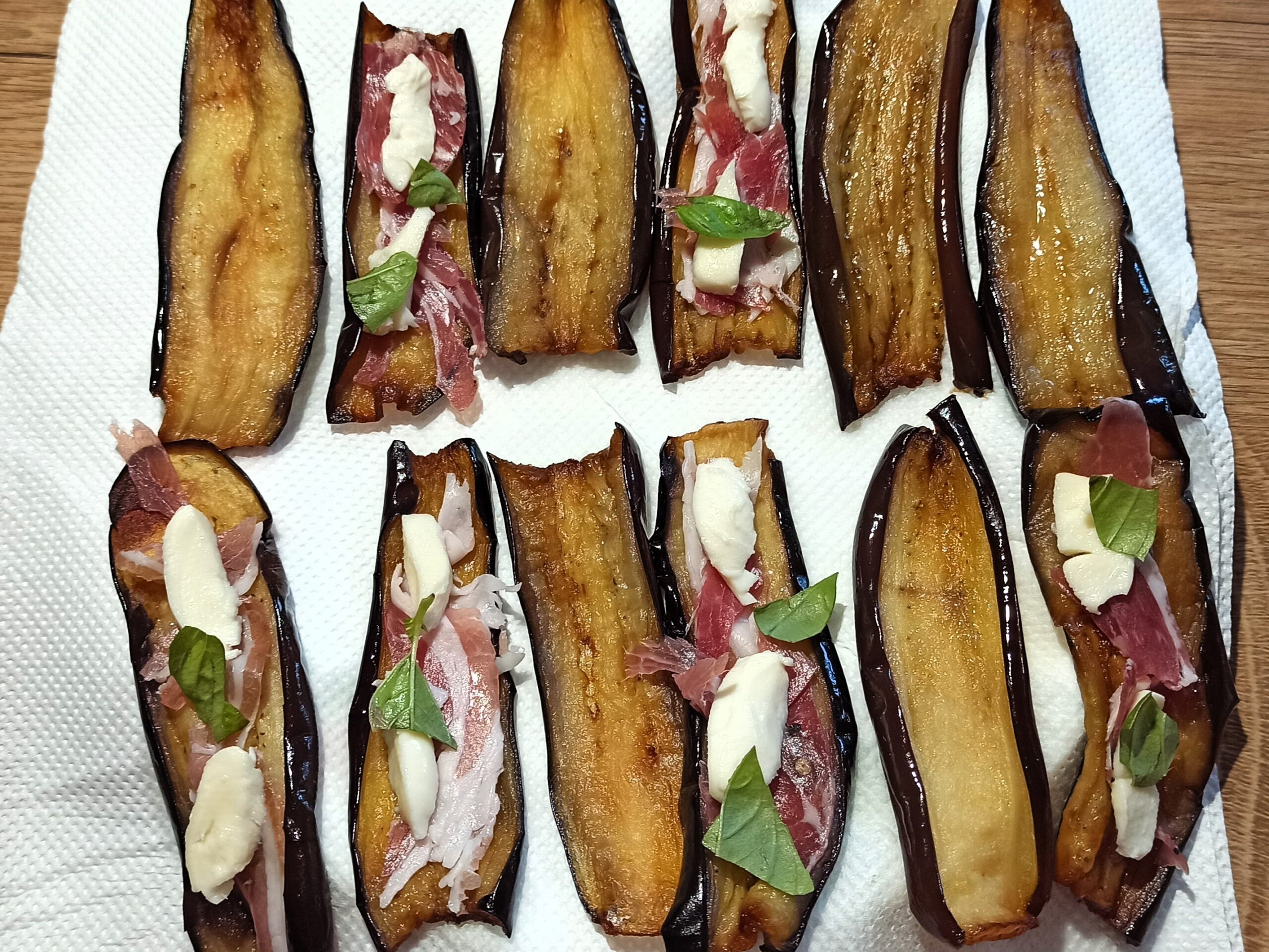 Sistemate la metà delle di melanzane sul piano da lavoro, mettete sopra il fiordilatte e la pancetta, sovrapponete con altra fetta di melanzana.