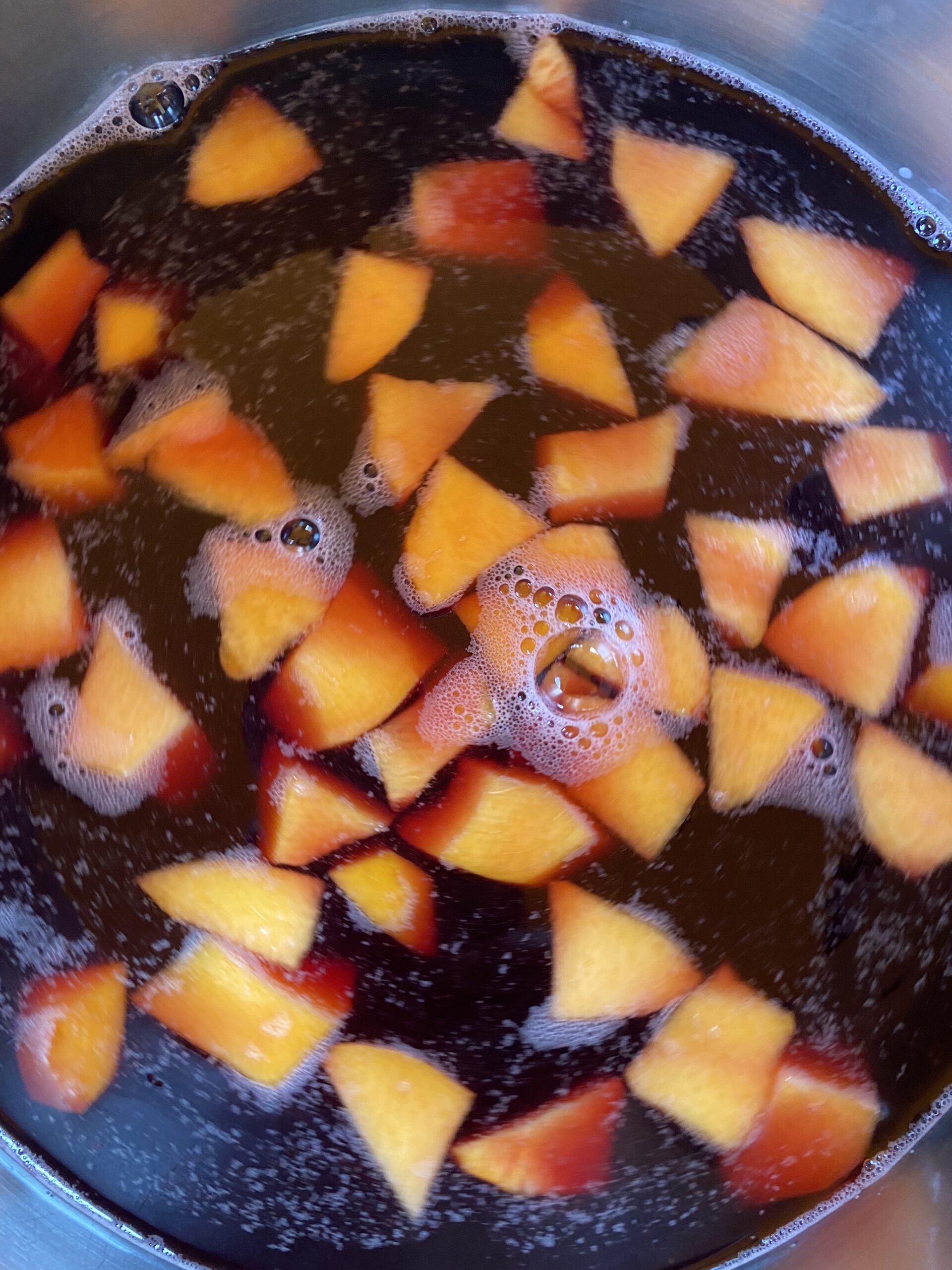 In primis vi comunico che la preparazione deve avvenire il giorno prima che si desidera bere la sangria in modo tale che può fermentare. Dunque, iniziate tagliando pesche gialle e mele a tocchetti e lasciateli da parte. Proseguite versando, in una casseruola grande o in un recipiente molto capiente, una bottiglia di Merlot e aggiungete poi 1 litro di succo all’arancia rossa. Mescolate per bene e versate poi la seconda bottiglia di Merlot, unita a quella di Lambrusco. Tornate a mescolare e terminate aggiungendo il secondo litro di succo d’arancia rossa.