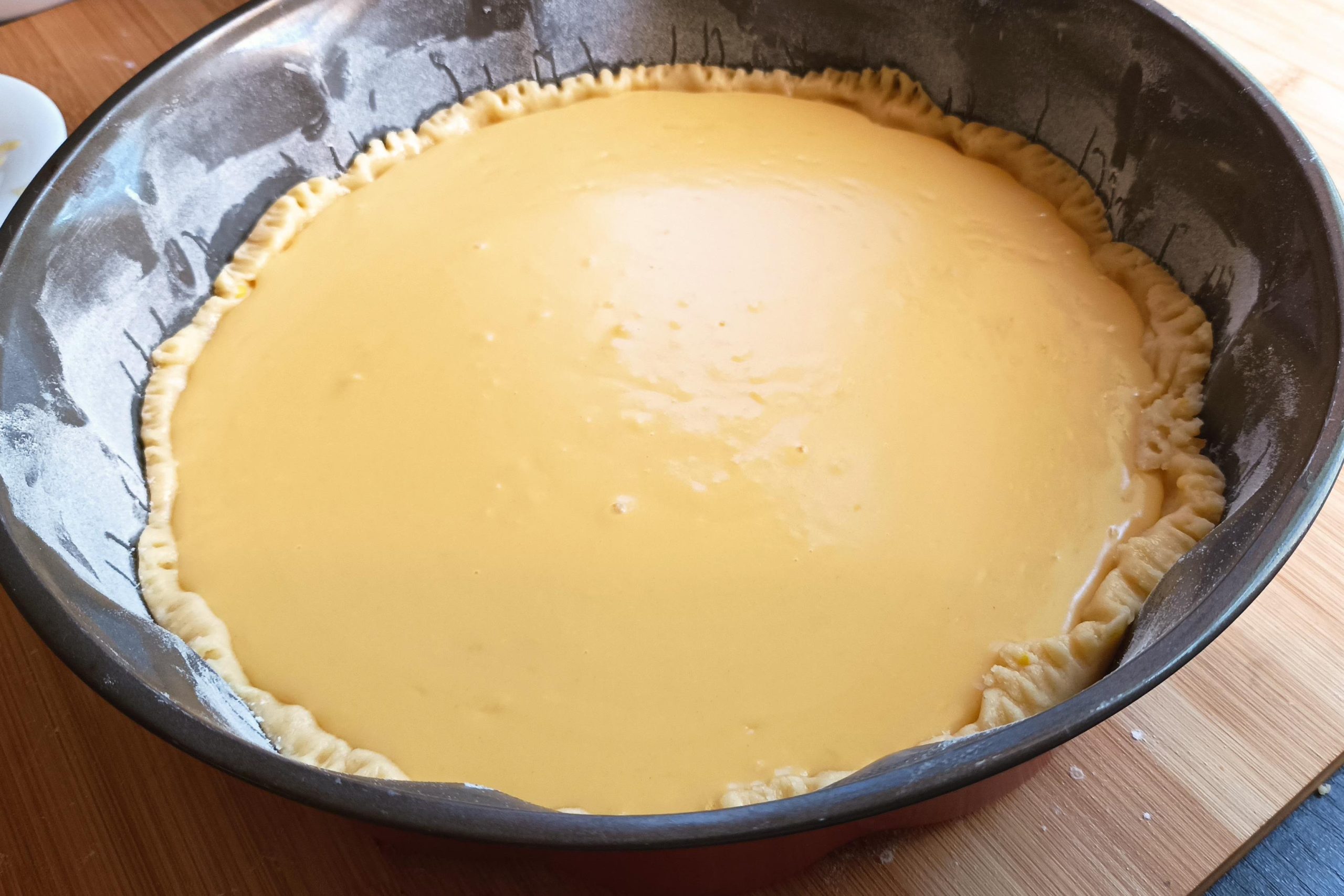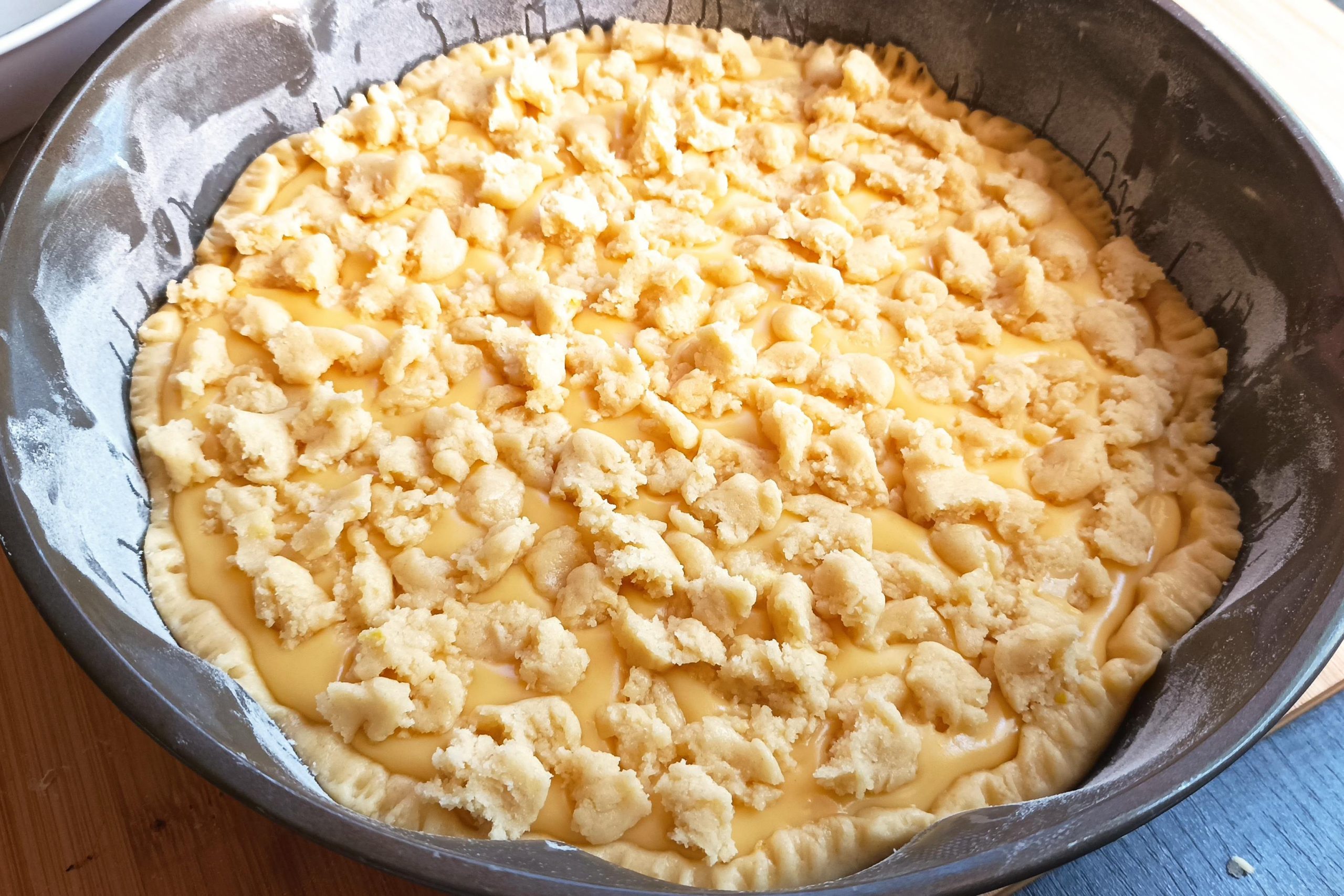 Imburrate e infarinate una teglia per torte: il vecchio metodo della nonna per formare una base e un bordo croccante e goloso; stendete 2/3 della pasta frolla direttamente sul fondo e sui bordi della teglia, bucherellatela con i rebbi di una forchetta, e versate dentro la crema al limone; con la forchetta schiacciate ed abbassate i bordi di pasta frolla fino al livello della crema.