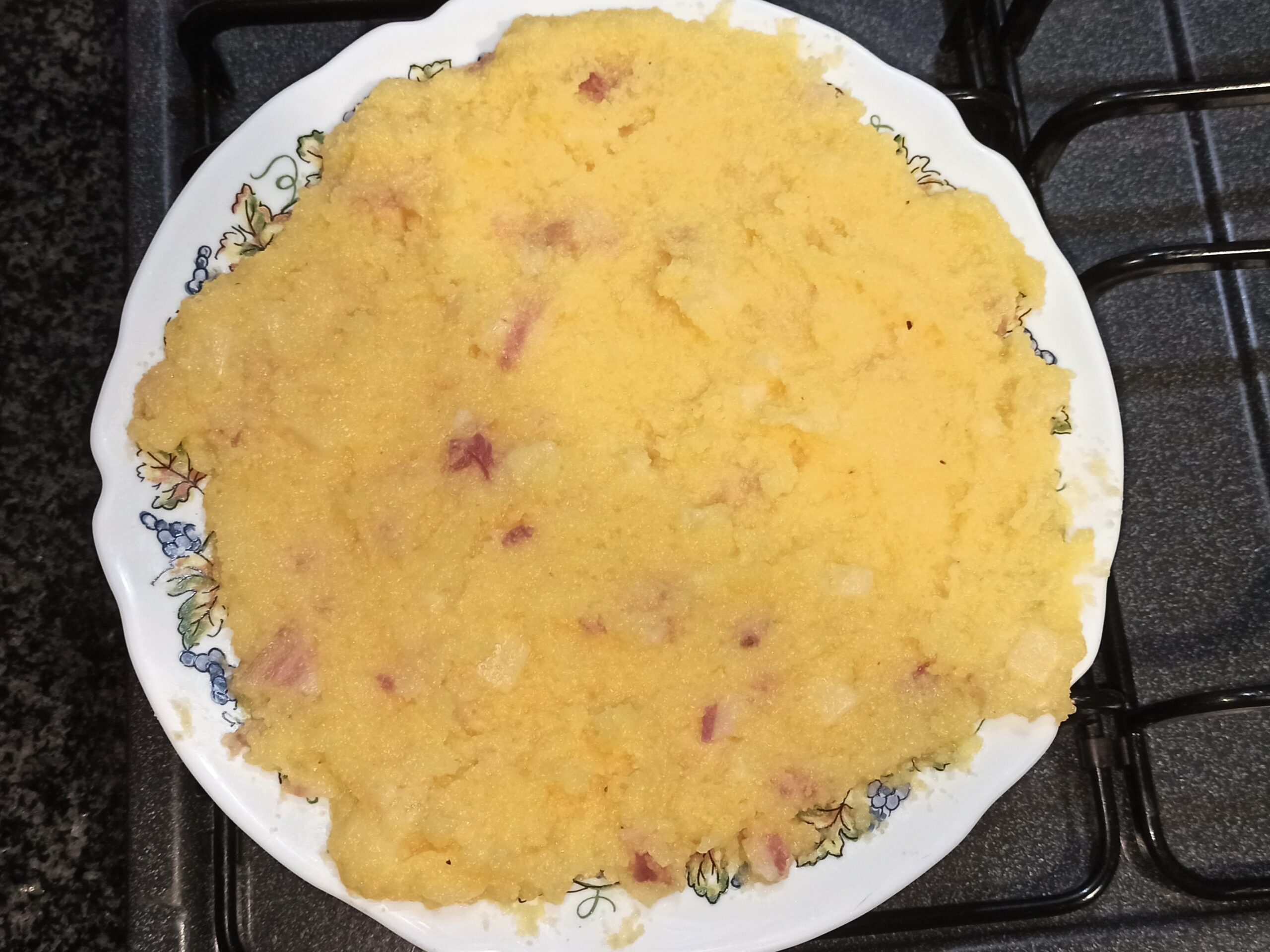 aggiungete il pepe, i salumi ed i formaggi, mescolate bene. Versate la polenta su un piatto e/o un vassoio, e fatela raffreddare completamente.