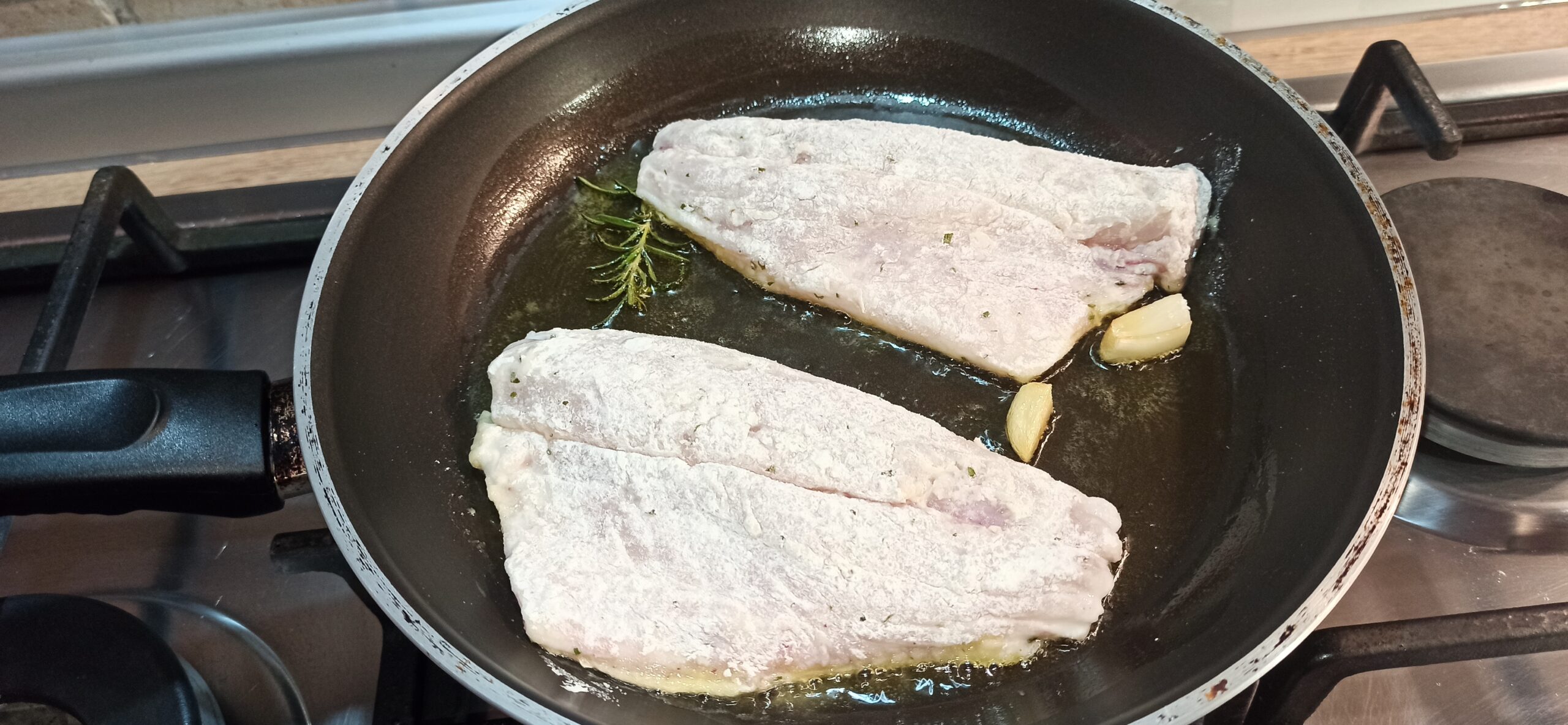 Sciacquate i filetti di orata, con acqua corrente fredda, sgocciolateli. In una capiente padella, mettete un paio di giri abbondanti di olio evo, con aglio e rosmarino. Infarinate i filetti di orata nel mix di farina, da entrambi i lati.
