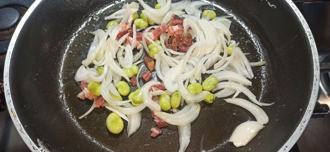 Tagliate la pancetta a pezzetti, tritate la cipolla a fettine sottili e disgranate le fave. Nella stessa padella dove avete cotto la carne, fate appassire le fettine di cipolla, se occorre aggiungete un altro poco d’olio. Unite anche le fave e la pancetta, fate rosolare per un minuto,