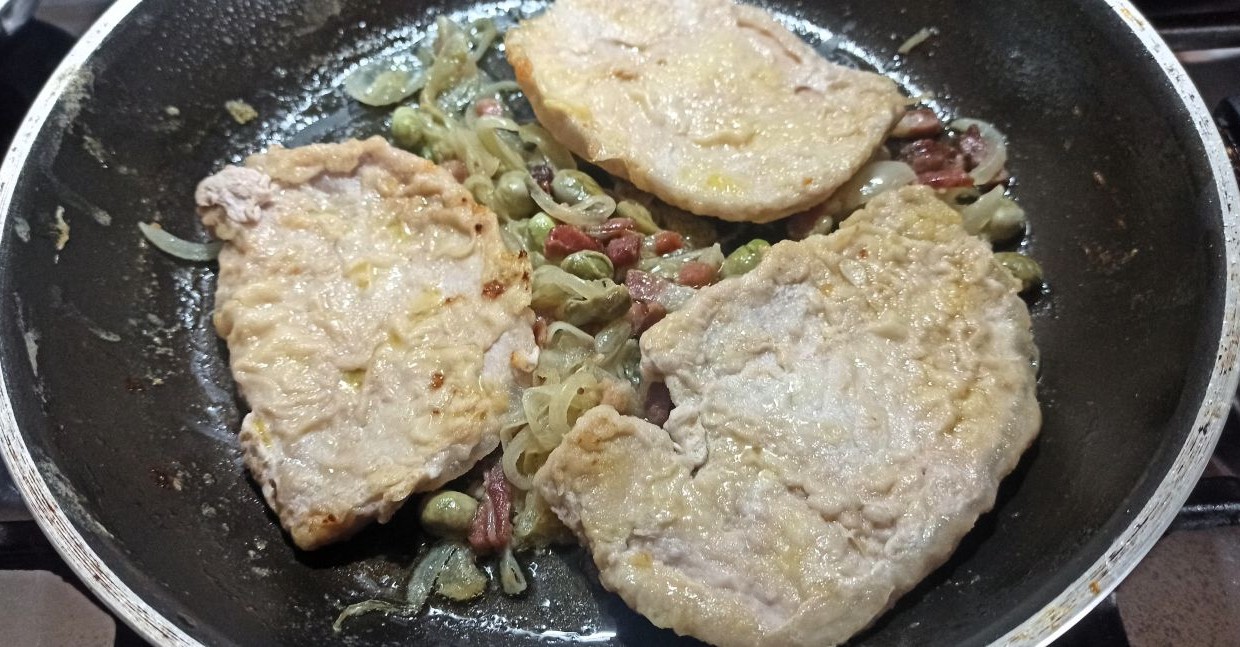 Le scaloppine di maiale con fave e pancetta, sono un secondo piatto semplice e saporito. Generalmente le fave fresche, vengono consumate crude, accompagnate da ricotta salata, formaggi stagionati, pancetta, ecc… Ci sono molte ricette che prevedono l’utilizzo delle fave fresche cotte, soprattutto quando iniziano a diventare grandi. In questa preparazione, ho utilizzato delle fave tenere, rosolate direttamente in padella, senza bisogno prima di lessarle. Un ottimo abbinamento di ingredienti, per altro già collaudati, per preparare il condimento della pasta, che hanno dato vita ad un secondo piatto davvero unico nel suo genere.