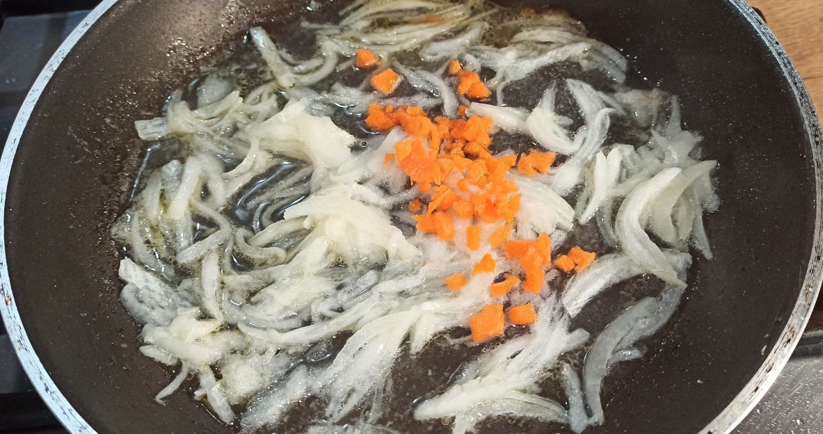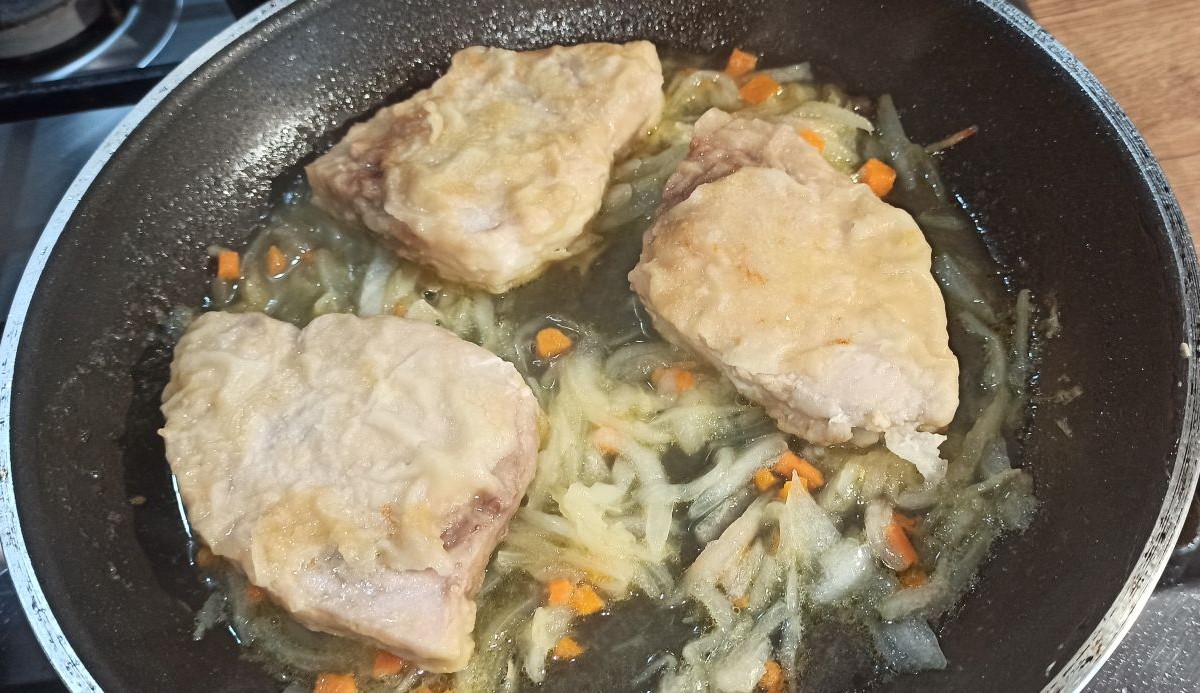 Sfumate con il brandy a fiamma alta. Fate evaporare l’alcol e mettete le fettine di pasce spada da parte. Nella stessa padella, aggiungete la cipolla tagliata a fettine sottili e la carota tagliata a pezzetti.