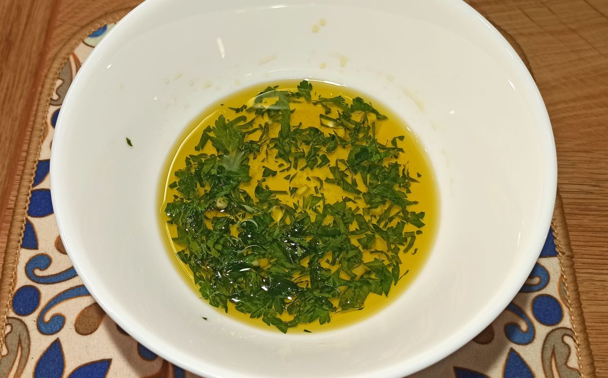 In una ciotolina, mettete l’olio evo, il sale, la buccia grattugiata del limone, il prezzemolo e l’aglio tritato, ed emulsionate bene.