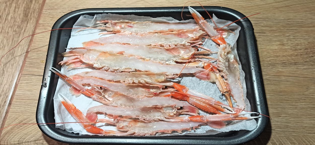 Disponete gli scampi, con il carapace in basso, su una leccarda foderata con carta forno.