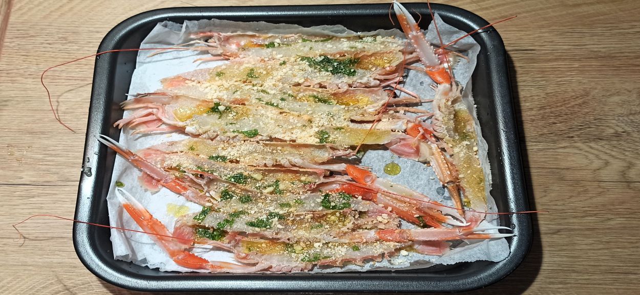 Con l’aiuto di un pennellino, distribuite il condimento su tutti gli scampi, terminate con il pane grattugiato.