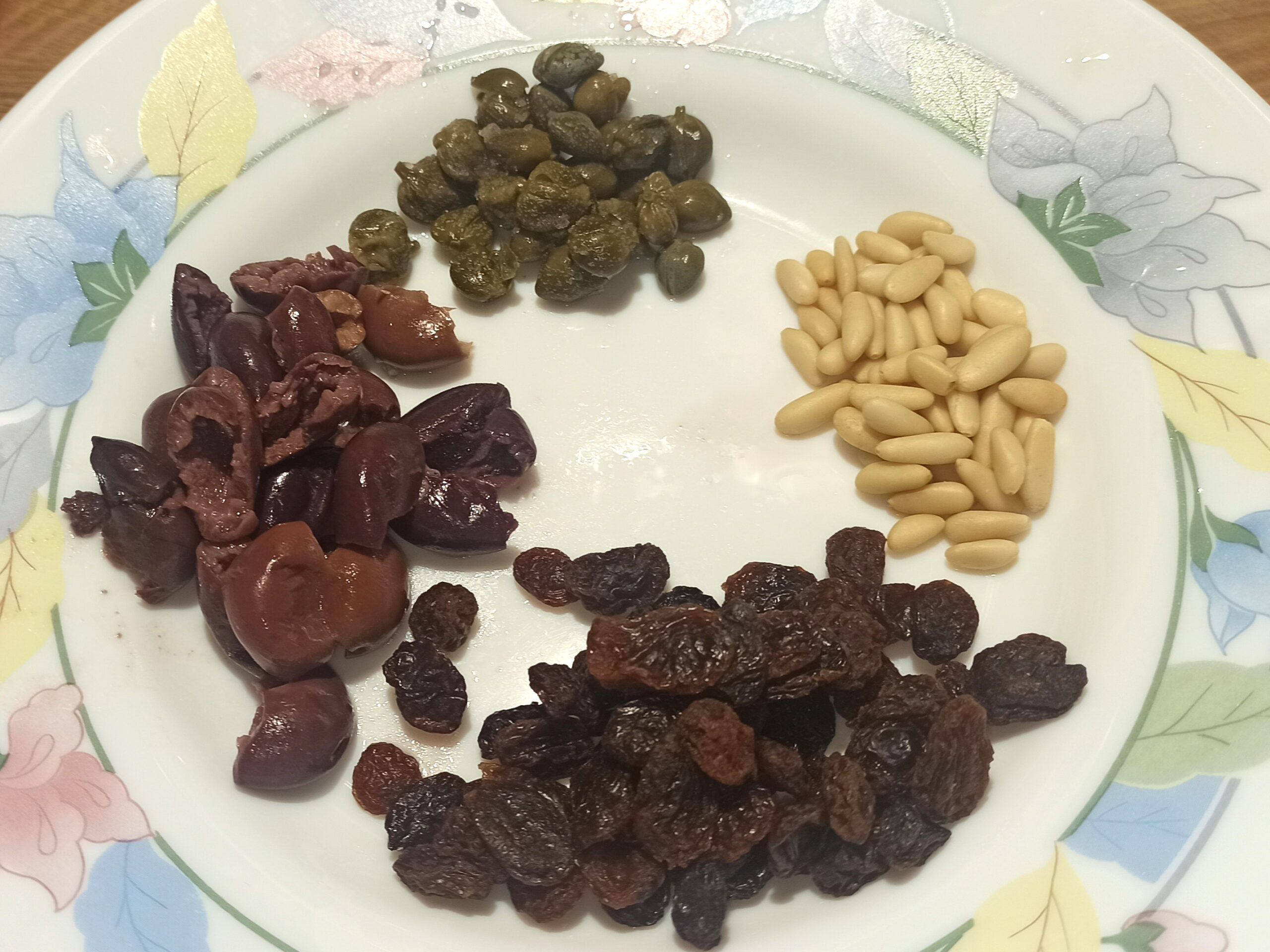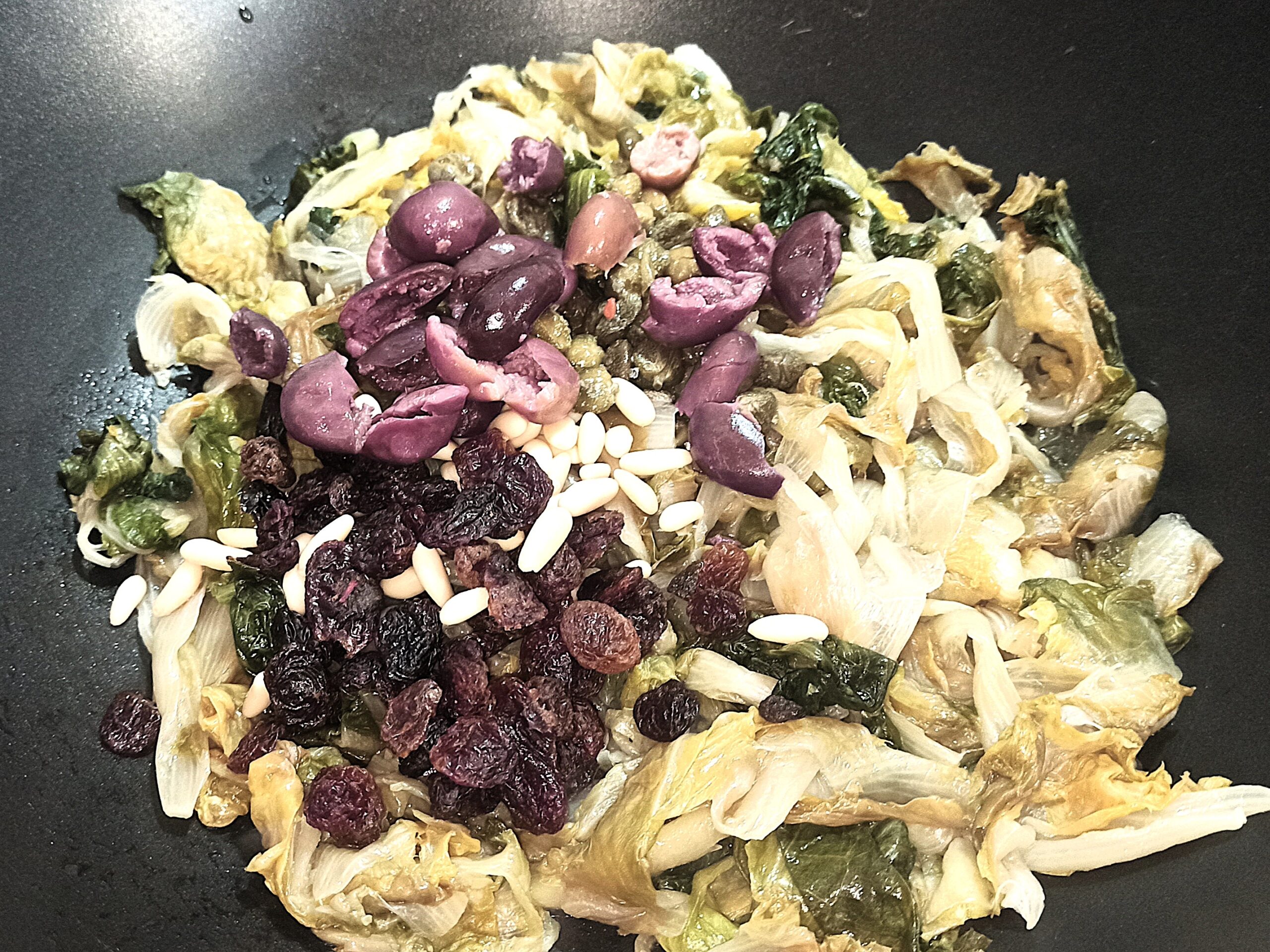 Aggiungete le scarole nella padella, fatele insaporire a fiamma media per qualche minuto, poi aggiungete le olive, i pinoli, l’uva passa ed i capperi.