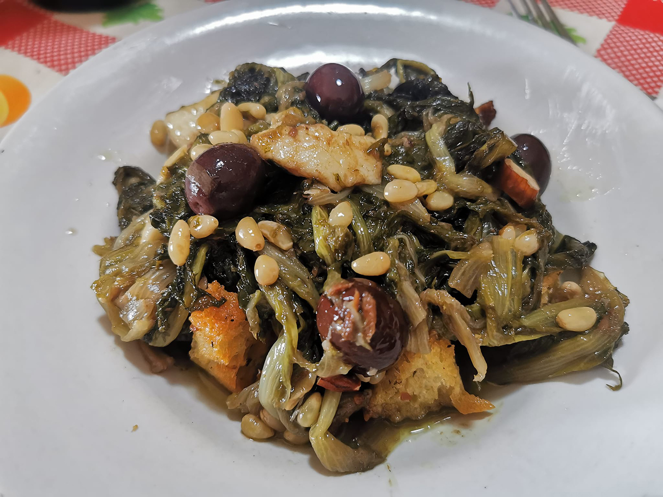 Scarole alla San Paolo, Un piatto tradizionale che racchiude i sapori autentici del Mediterraneo: la dolcezza delle scarole, il sapore deciso delle acciughe e delle olive, il croccante dei pinoli e delle noci, e un tocco di piccantezza dato dal peperoncino. Perfetto come contorno ricco o piatto unico leggero!
