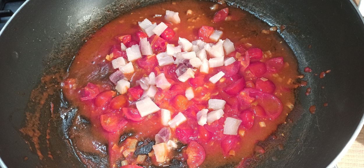 La pasta allo scarpariello. è una ricetta antichissima della tradizione partenopea. Un condimento preparato velocemente a base di pomodori e formaggio. Ho preparato questa ricetta, aggiungendo ai pomodori dei tocchetti di pesce spada, utilizzando della pasta al vino rosso. Ovviamente non utilizzato il formaggio, che potete sostituirlo tranquillamente con della bottarga, o delle uova di pesce.