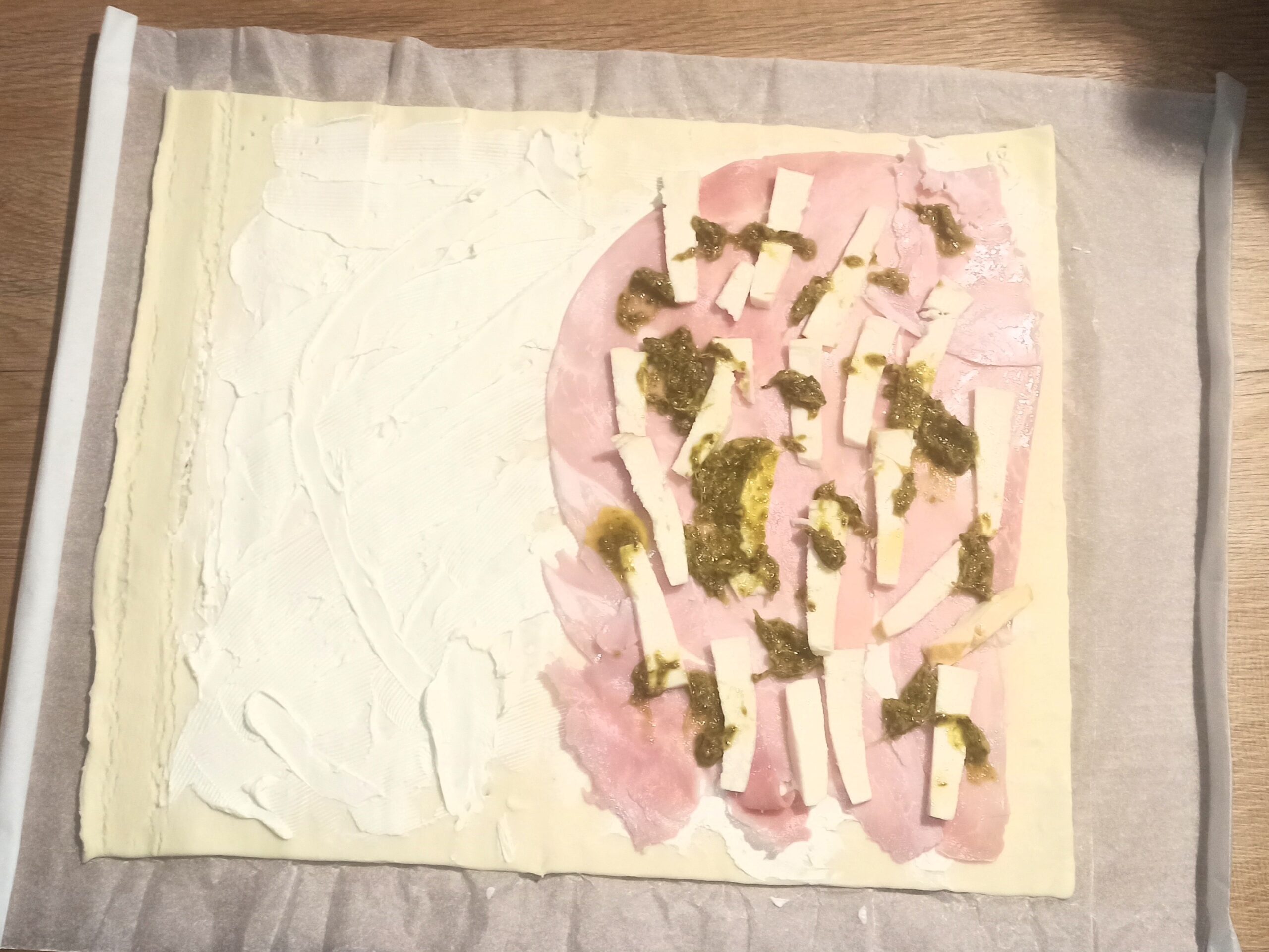Spalmate con il formaggio spalmabile la superfice interna. Su metà sfoglia, aggiungete le fette di prosciutto cotto, il pesto di basilico e la scamorza tagliata a pezzetti.