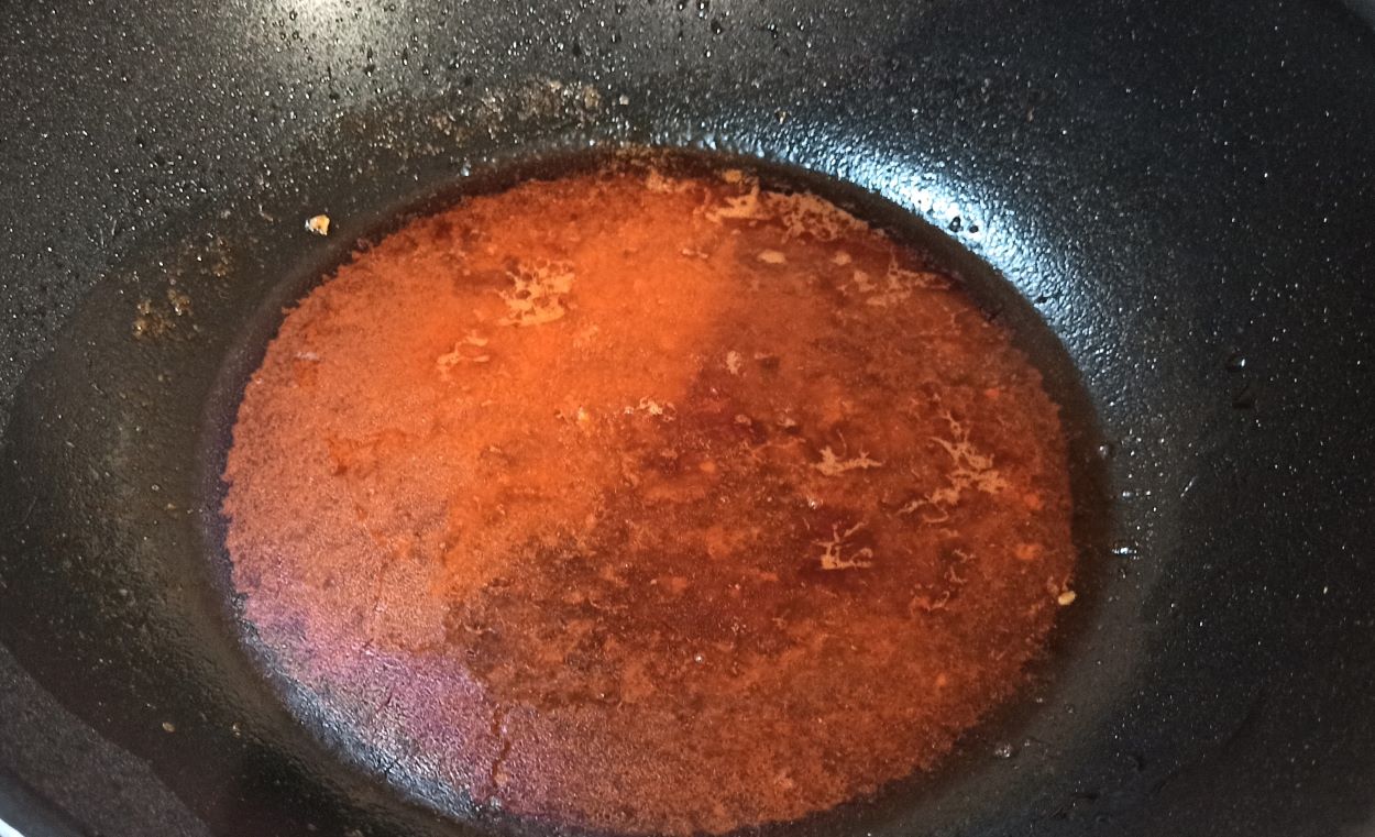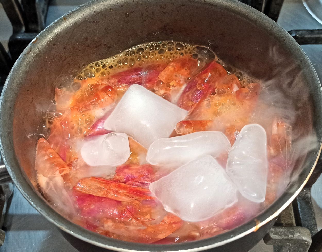 In un capiente pentolino, mettete le teste, alle quali avrete eliminati gli occhi, ed i carapaci dei gamberi rossi, un giro d’olio evo, lo spicchio d’aglio. Fate rosolare a fiamma vivace, poi sfumate con il vino bianco. Appena, l’alcol sarà evaporato, aggiungete il ghiaccio.
