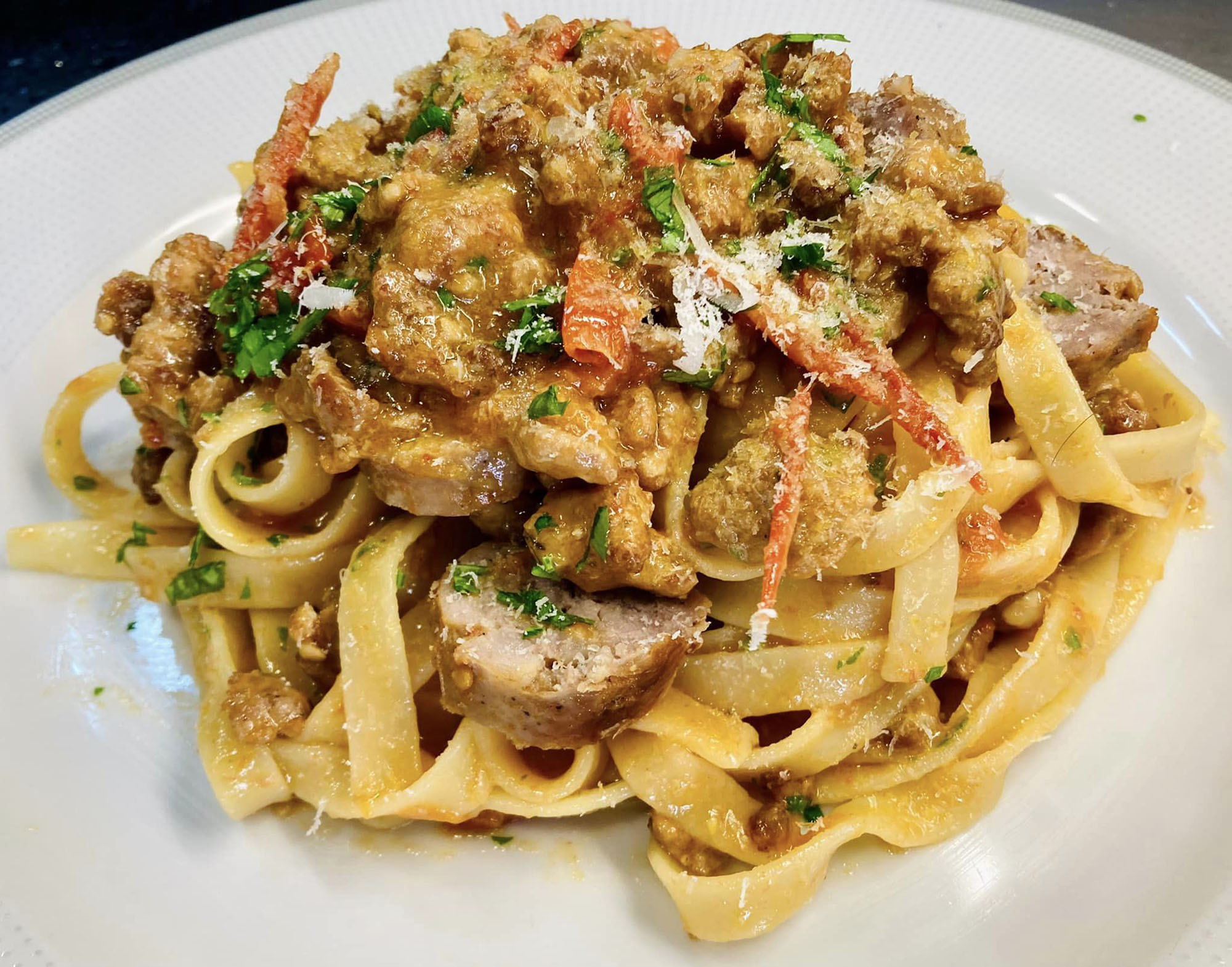 Gli scialatielli del vecchio Casale con salsiccia e pomodorini sono un vero e proprio inno alla cucina napoletana. A partire dal formato di pasta, doppio, lungo e consistente, capace di raccogliere un bel po’ di condimento a ogni forchettata. Già la sola pronuncia del nome ci riporta al sud. Per passare alla salsiccia, una regina della regione, protagonista di moltissime ricette paesane. Continuando con i pomodorini, che devono essere quelli del piennolo del Vesuvio dop, ricchi di sapore e di meraviglia. Non possiamo che concludere con il basilico, perché anche il naso vuole la sua parte e lui sa profumare come niente. Sono un primo piatto veloce ma ricco, che le nonne napoletane sono solite fare per visite improvvise soprattutto da parte dei nipoti che trovano sempre sciupati. Insomma un piatto della vera tradizione campana che dovrete assolutamente assaggiare.