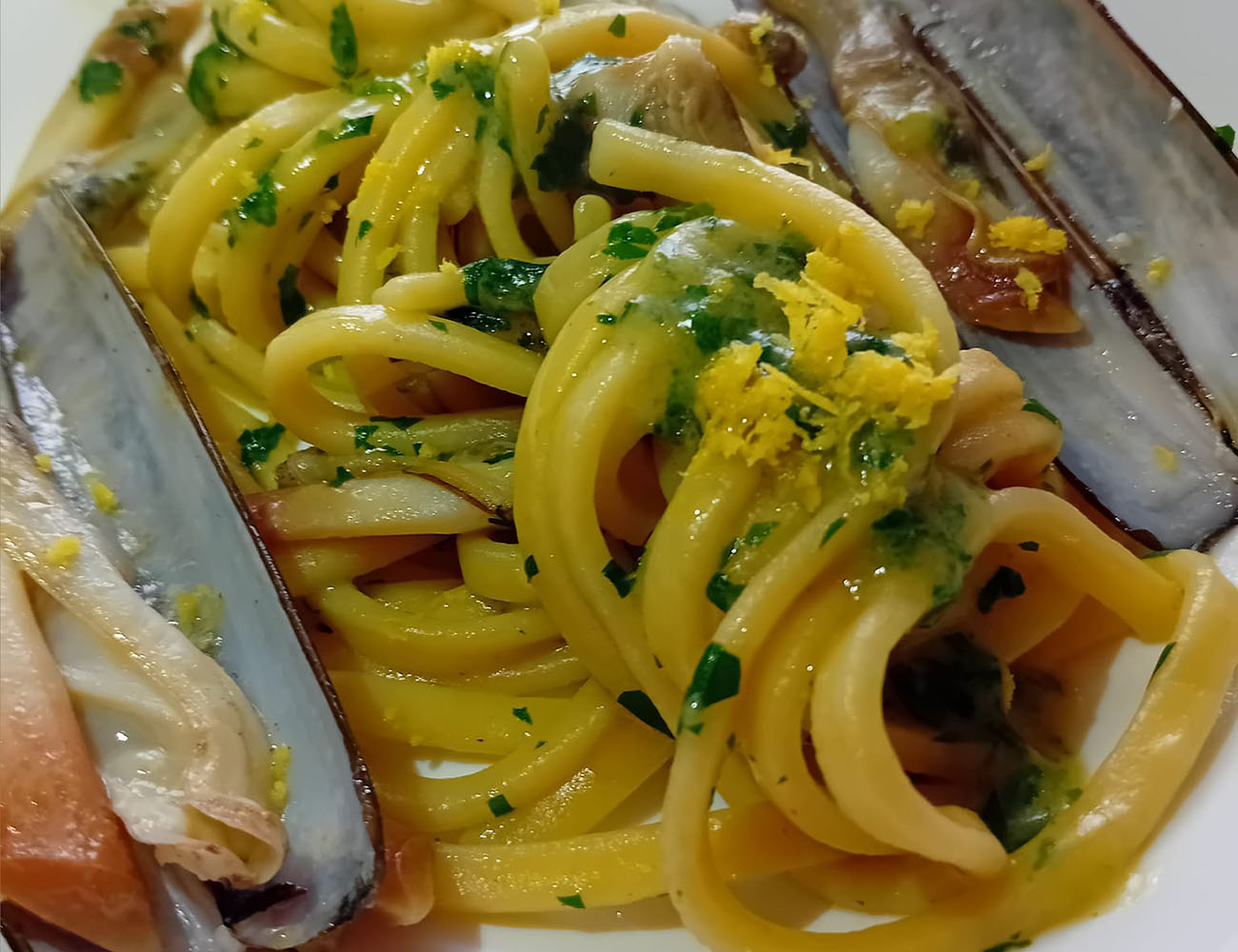 Trasferite gli scialatielli nella padella con i cannolicchi e continuate la cottura, aggiungendo acqua di cottura della pasta se necessario per mantenere la giusta consistenza del sugo. Negli ultimi minuti di cottura, aggiungete abbondante prezzemolo tritato e mescolate bene per amalgamare i sapori. Una volta che la pasta è cotta al dente, impiattate aggiungendo i cannolicchi con guscio messi da parte. Completate con una grattugiata di buccia di limone e, se necessario, un’ulteriore spolverata di prezzemolo tritato. Servite immediatamente. I vostri scialatielli freschi con cannolicchi sfumati alla birra sono pronti.