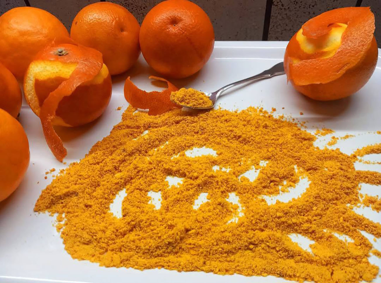 Basteranno un paio di giorni per raggiungere una essiccazione perfetta ( ovviamente tutto dipende da quanto tenete accesi i vostri riscaldamenti, i tempi potrebbero variare per questo). E inoltre avrete un bellismo profumo in casa. Comunque sia le scorze saranno pronte per essere tritate quando schiacciandole si spezzano con un rumore sordo. Se contrariamente vi accorgete che ancora si piegano dovranno asciugare ancora un po. Passatele quindi in un mixer e frullate più volte con piccole pause finché non otterrete una polvere papabile ma soprattutto profumatissima ( come quella della foto).