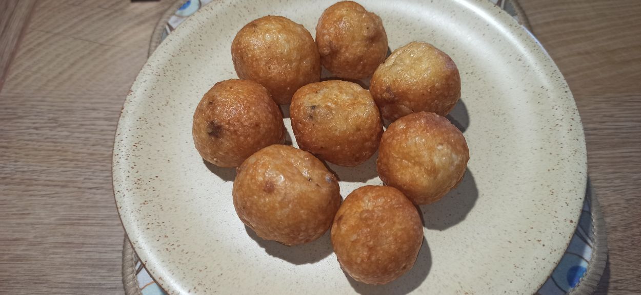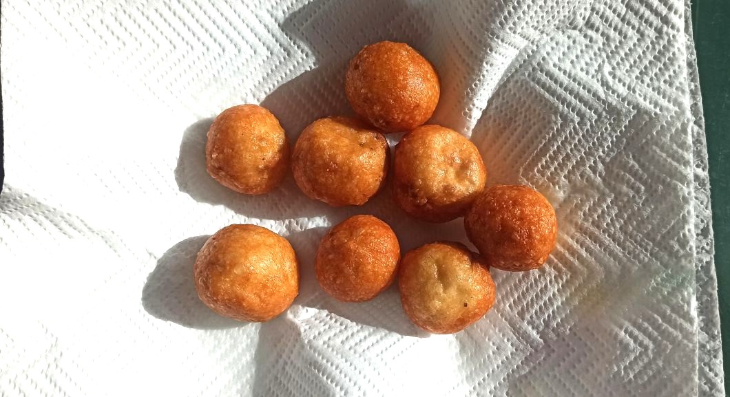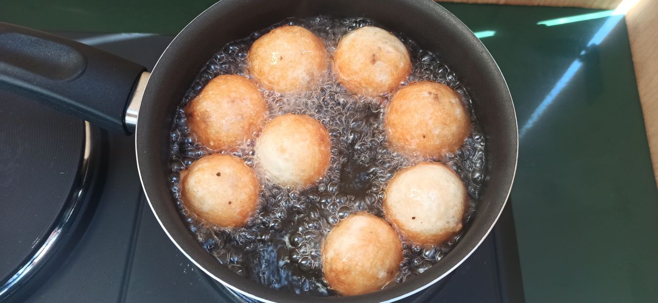 Scaldate l’olio di semi di arachidi, in un pentolino dai bordi alti. Cuocete poche sfere alla volta, girandole spesso, in modo da ottenere una doratura uniforme.