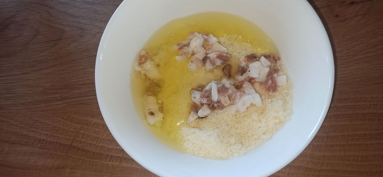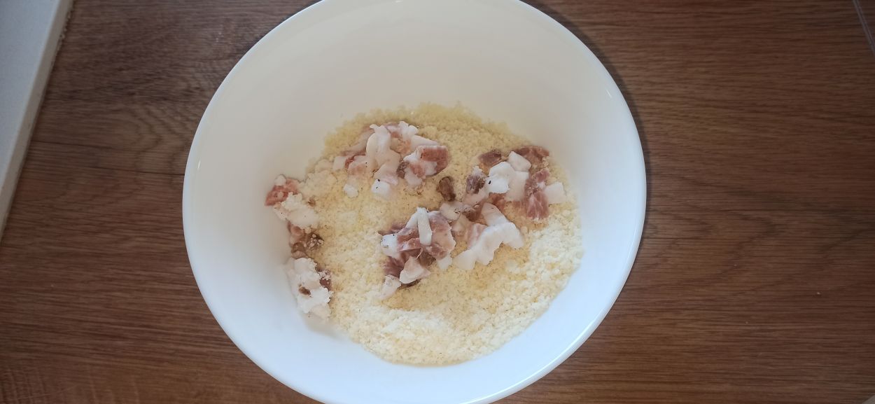 Tagliate il guanciale a pezzetti piccoli, ed unitelo al mix di formaggi.