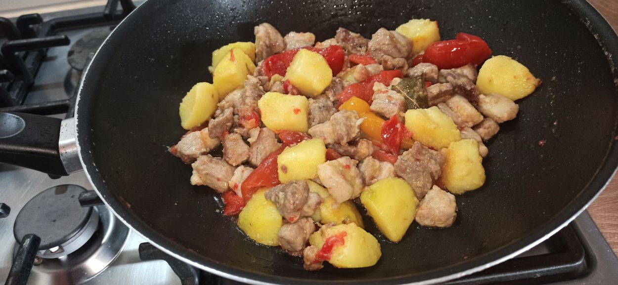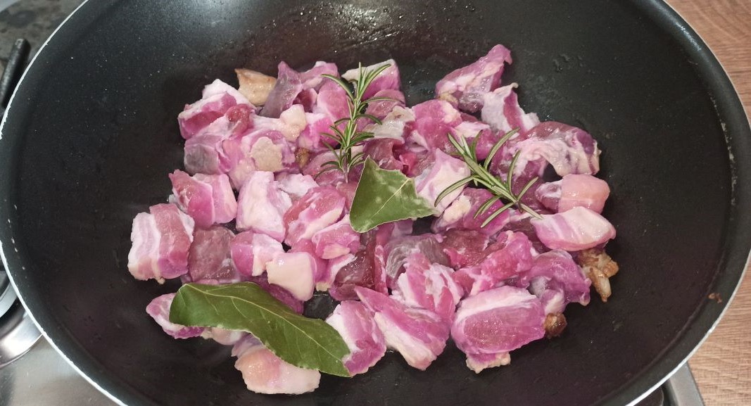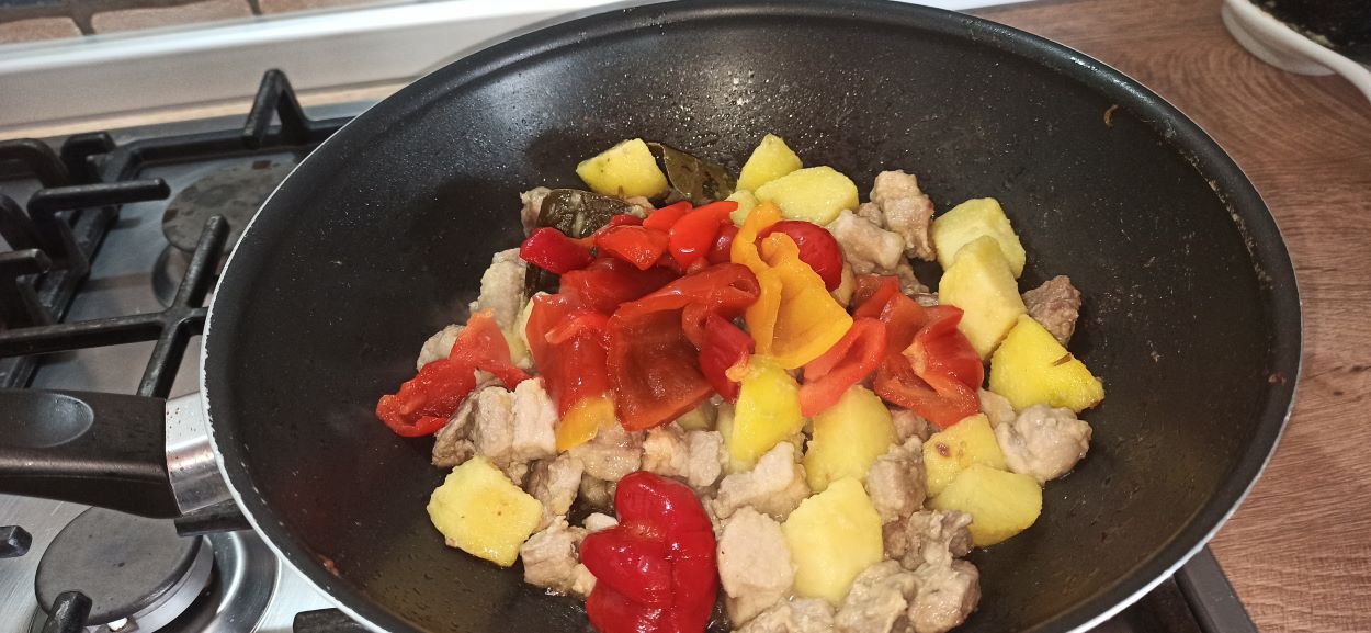 Sbucciate le patate, tagliatele a pezzi, e lasciatele a bagno in acqua fredda. Eliminare anche i semi ed il torso dei peperoni, poi passarli velocemente sotto acqua corrente, in modo da eliminare l’aceto in eccesso, tagliateli a pezzi e metteteli a colare. Mettete la carne di maiale in una capiente padella, insieme alle foglie di alloro e al rosmarino. Iniziate a cuocerla a fiamma media, senza aggiungere ulteriori grassi.
