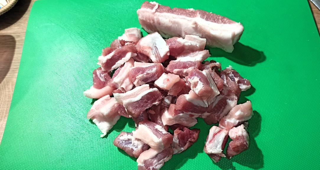 Per preparare la sfrittuliata di carnevale, iniziate a tagliare a pezzetti la carne di maiale.