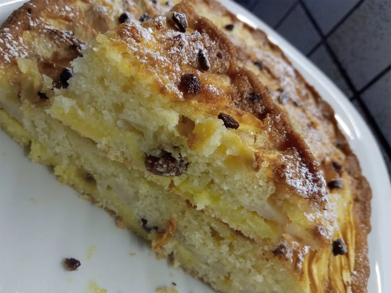 Versare metà del composto in quest’ ultima … aggiungere la crema ..l’ uvetta ..e la mela tagliata a cubetti…di nuovo il restante composto ..ricoprirlo con fettine di pera e qualche goccia di cioccolato.