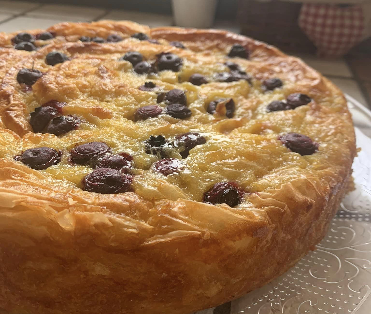 Inforna la Soufra a 180°C per circa 25-30 minuti, o fino a quando la superficie è dorata e croccante. Una volta cotta, lascia raffreddare completamente prima di tagliarla a quadretti o rettangoli. Servi la Soufra ai mirtilli e crema al limone a temperatura ambiente, magari con una spolverata di zucchero a velo e qualche foglia di menta fresca per decorare. Puoi sostituire i mirtilli con lamponi o fragole per un sapore diverso, oppure aggiungere un po’ di mandorle tritate tra i fogli di pasta fillo per una croccantezza extra.