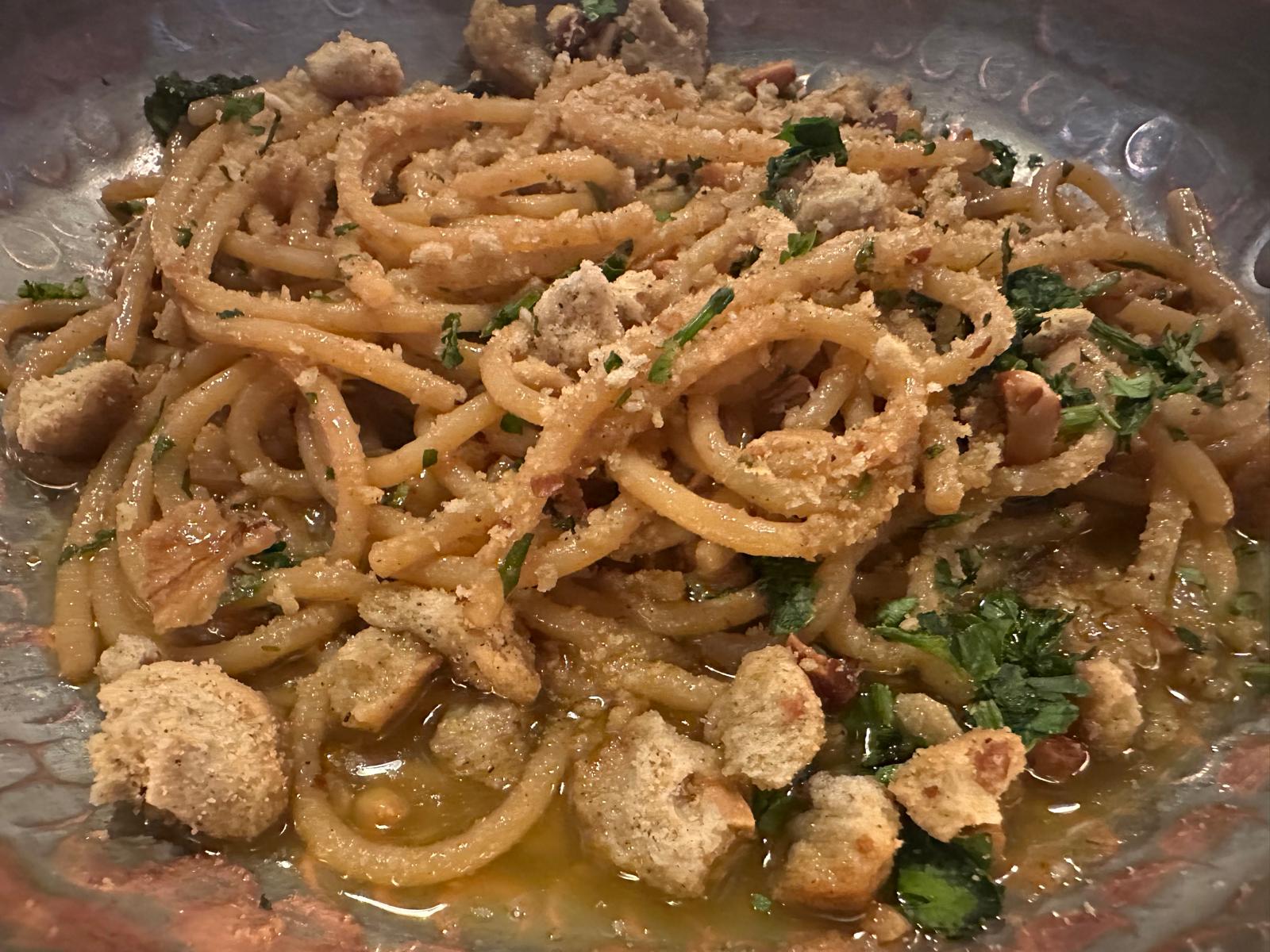 Spaghetti Aglio, Olio, Peperoncino di Mastu Giacumo super cremosi con il tocco in più dei Taralli Napoletani Sbriciolati. Un piatto che unisce tradizione e innovazione, dando un tocco croccante e ancora più saporito alla classica pasta aglio, olio e peperoncino grazie ai taralli napoletani sbriciolati. Il loro gusto deciso di mandorle e pepe si sposa alla perfezione con la semplicità della ricetta, creando un’esplosione di sapori unici.