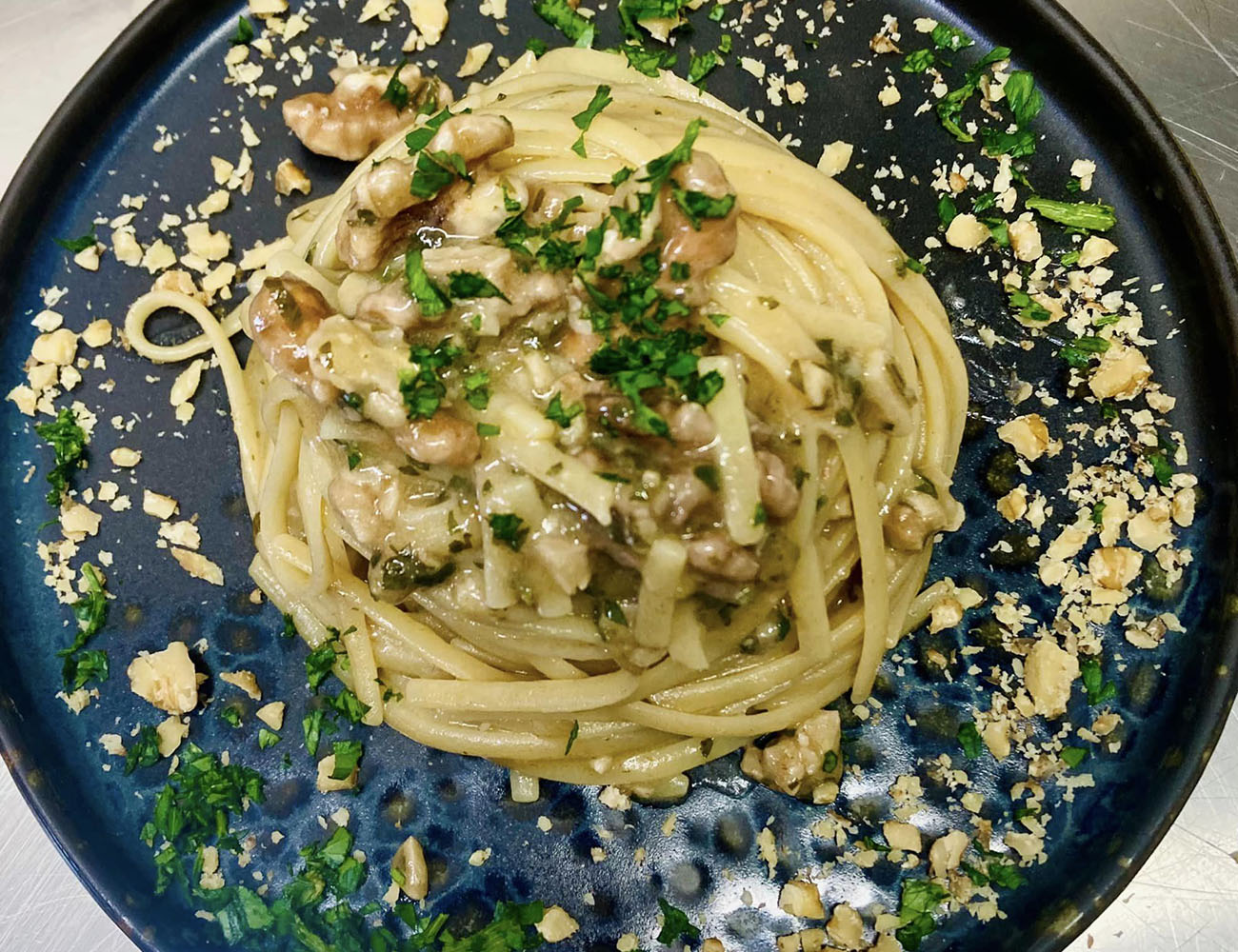 Ora Aggiungi le noci: Tritare grossolanamente le noci e aggiungerle al soffritto, mescolando bene per un minuto. Questo conferirà croccantezza e un gusto deciso al piatto. Scola gli spaghetti, tenendo da parte una tazza di acqua di cottura. Versa la pasta nella padella con il condimento e aggiungi un po’ dell’acqua di cottura della pasta, quanto basta per amalgamare bene. Mescola il tutto per qualche minuto a fuoco medio, aggiungendo eventualmente ancora un po’ di acqua di cottura se necessario per ottenere una consistenza cremosa. Completare con una spolverata di prezzemolo fresco tritato per un tocco di freschezza. Distribuisci gli spaghetti nei piatti, aggiungi un filo d’olio a crudo se gradito, e servi subito. Buon appetito!