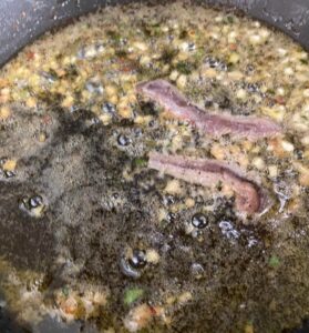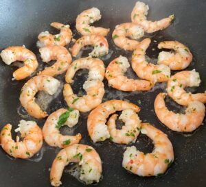 Mentre la pasta cuoce, preparare la salsetta nello stesso fondo di cottura: Inserire due spicchi d’aglio ben tritati, mezzo cucchiaino di pepe rosso, e due acciughine. Sciogliere le acciughie e quando la pasta à pronta, inserirla in padella, insaporire e saltare. Aggiungere del prezzemolo. Inserire i gamberi e un filo d’olio e saltare ancora. Impiattare e buon appetito