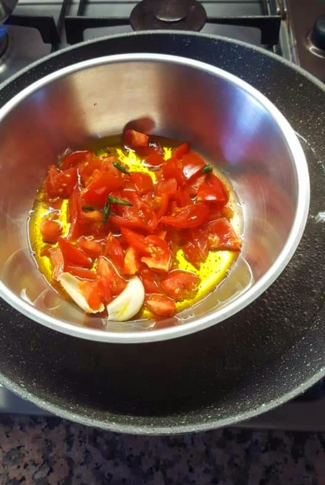 Mettere in una pentola a bollire l’acqua leggermente salata per la cottura della pasta. In una padella media mettere dentro un po’ di acqua che non superi la meta dell’ altezza di quest’ultima poi adagiarci dentro una ciotola preferibilmente di acciaio dove metteremo l’olio, l’aglio, il peperoncino ed i pomodorini tagliati a metà o in quattro parti a seconda della grandezza. Lasciare cuocere il tutto a bagnomaria per una decina di minuti calcolando il tempo dall’ inizio del bollore dell’ acqua e poi spegnere.