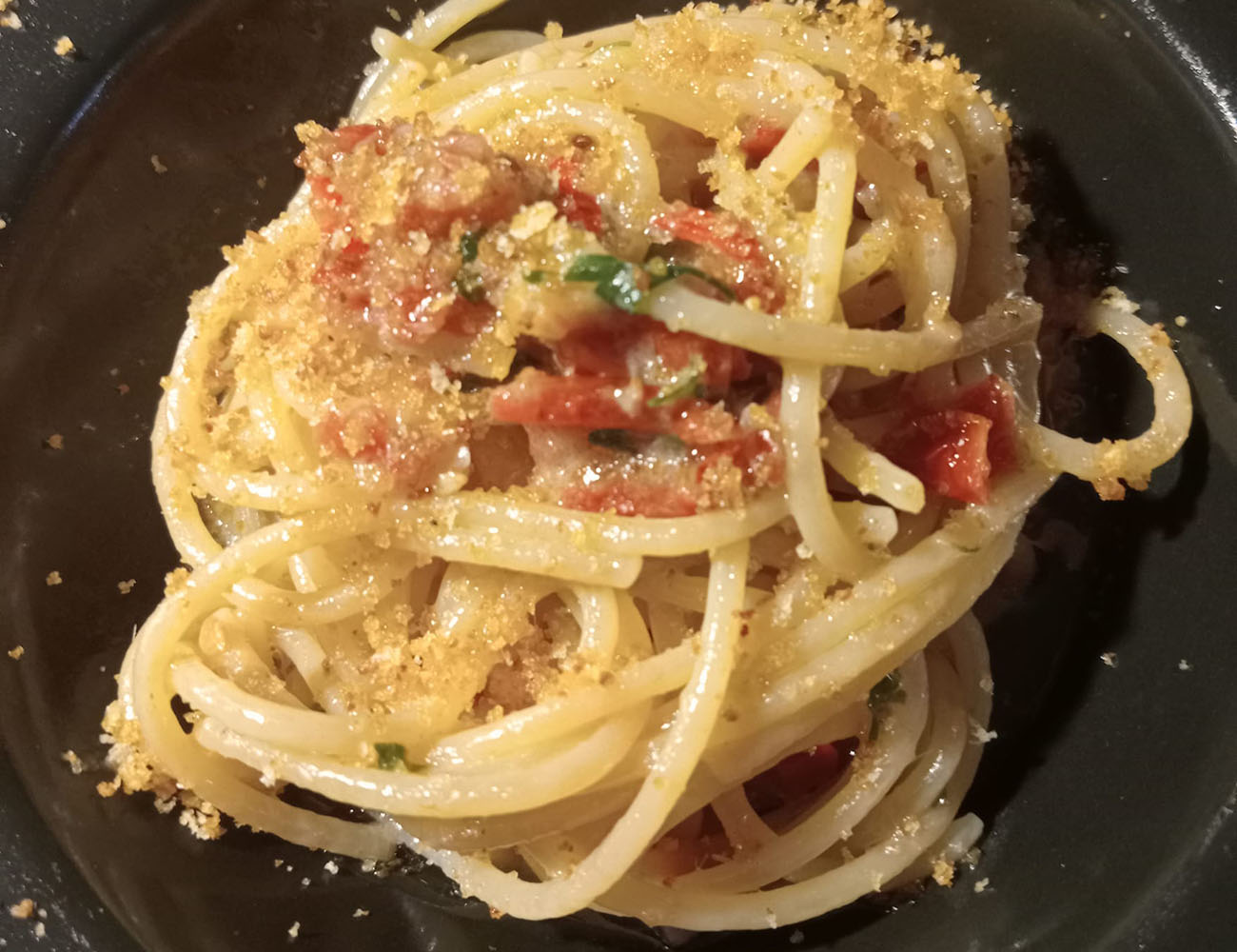 Cominciamo con il Preparare i pomodori secchi: Frullate i pomodori secchi sott’olio con un filo di olio extravergine, fino a ottenere una crema densa e uniforme. Tenete da parte. Ora bisogna Tostare il pangrattato: In una padella antiaderente, scaldate un filo d’olio e tostate il pangrattato mescolando continuamente, finché non sarà dorato e croccante. Aggiungete un pizzico di sale e, se volete, un tocco di peperoncino per renderlo più aromatico. Mettete da parte.
