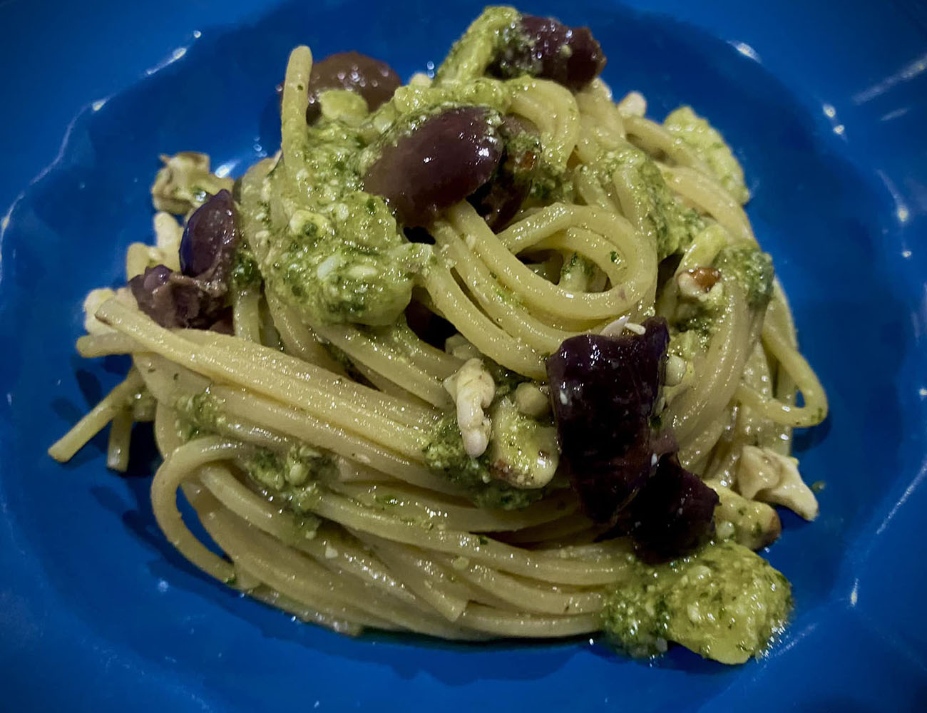 Spaghetti al mandolino con pesto di salvia, colatura di alici, noci e limone