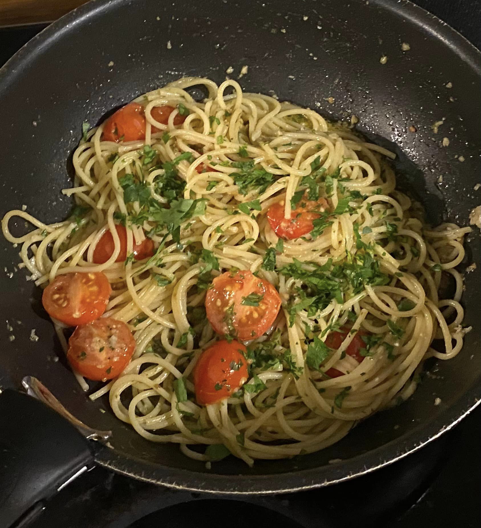 Nel fondo di cottura versiamo un cucchiaio di olio e imbiondiamo l’aglio che abbiamo precedentemente tritato finemente. Poi aggiungiamo i pomodorini, marinati con olio, sale e origano e cuociamo a fiamma media, 5 minuti circa. Intanto bagnamo con un filo d’acqua di cottura della pasta la mistura nel frullatore, e frulliamo fino ad ottenere una salsina consistente di pesto. Inseriamo gli spaghetti al dente in padella, un filo d’acqua di cottura, saltiamo e mescoliamo. Poi versiamo il pesto e amalgamiamo insieme ad una spolverata di prezzemolo. Impiattiamo e serviamo i sapori della nostra terra