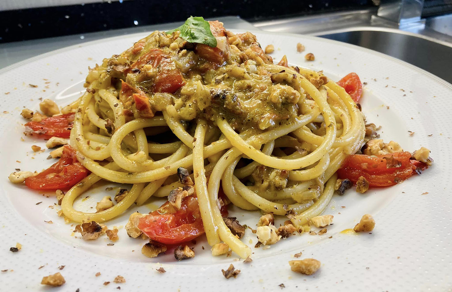 Spaghetti con pesto di basilico pomodorini e noci